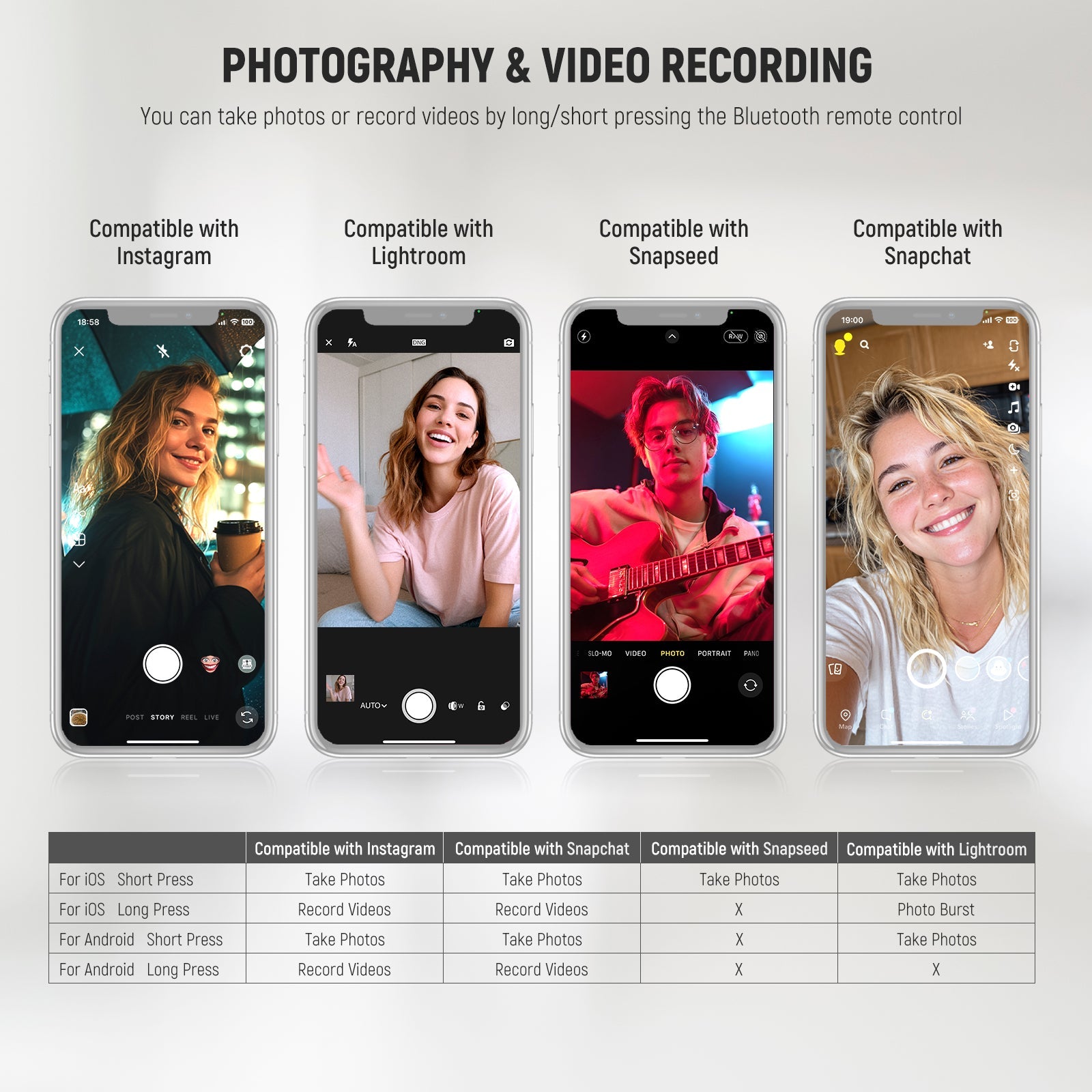- Take Selfies with a Press- Pair this remote shutter release with your iOS/Android smartphone or tablet via Bluetooth connection for selfies, portraits, YouTube TikTok videos, Tik Tok vlogging, and Zoom calls—all with 1 tap in your palm. Short press for photos, long press for videos