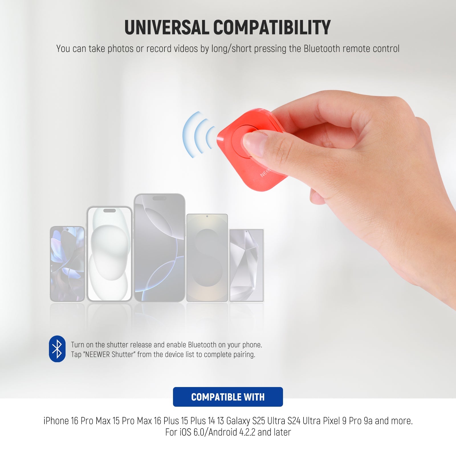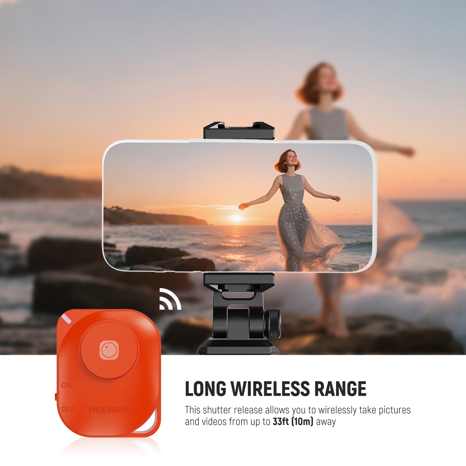 - Extended Wireless Range- This shutter release allows you to take pictures and videos wirelessly from up to 33ft (10m) away — no need to reach your arm to the phone screen