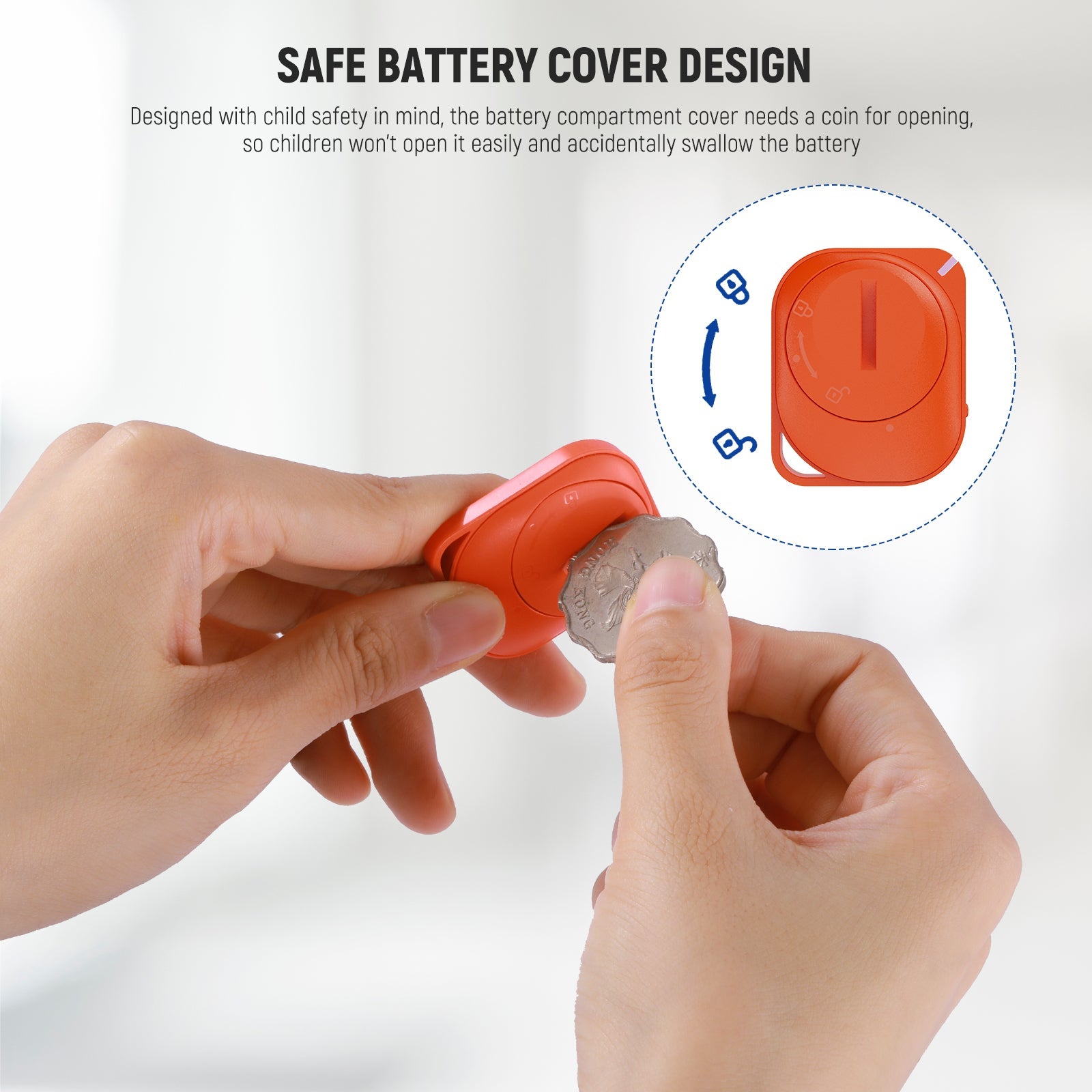 - Child Safe Battery Cover- Designed with child safety in mind, opening the battery cover requires a coin to prevent children from accidentally swallowing the battery. The CR2032 battery requires low power consumption and gives you a longer battery life
