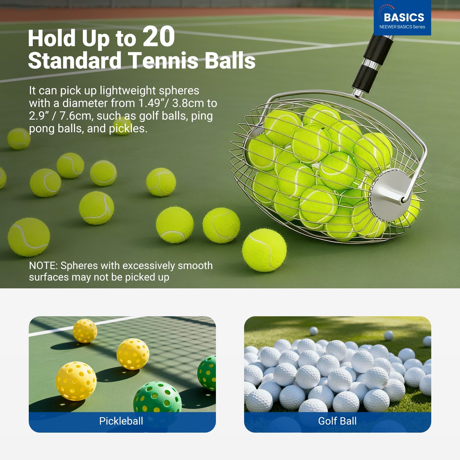 - Introducing NEEWER BASICS- Simple and practical, NEEWER BASICS is an economical product line that focuses on essential functions and designs, without unnecessary extras and materials. The TB04S is an efficient tennis ball rolling picker with a total capacity of up to 20 standard tennis balls