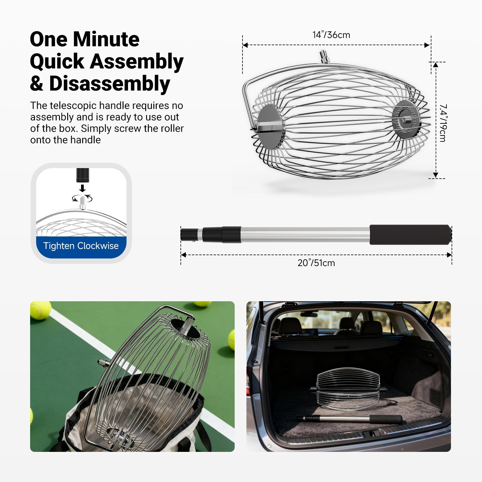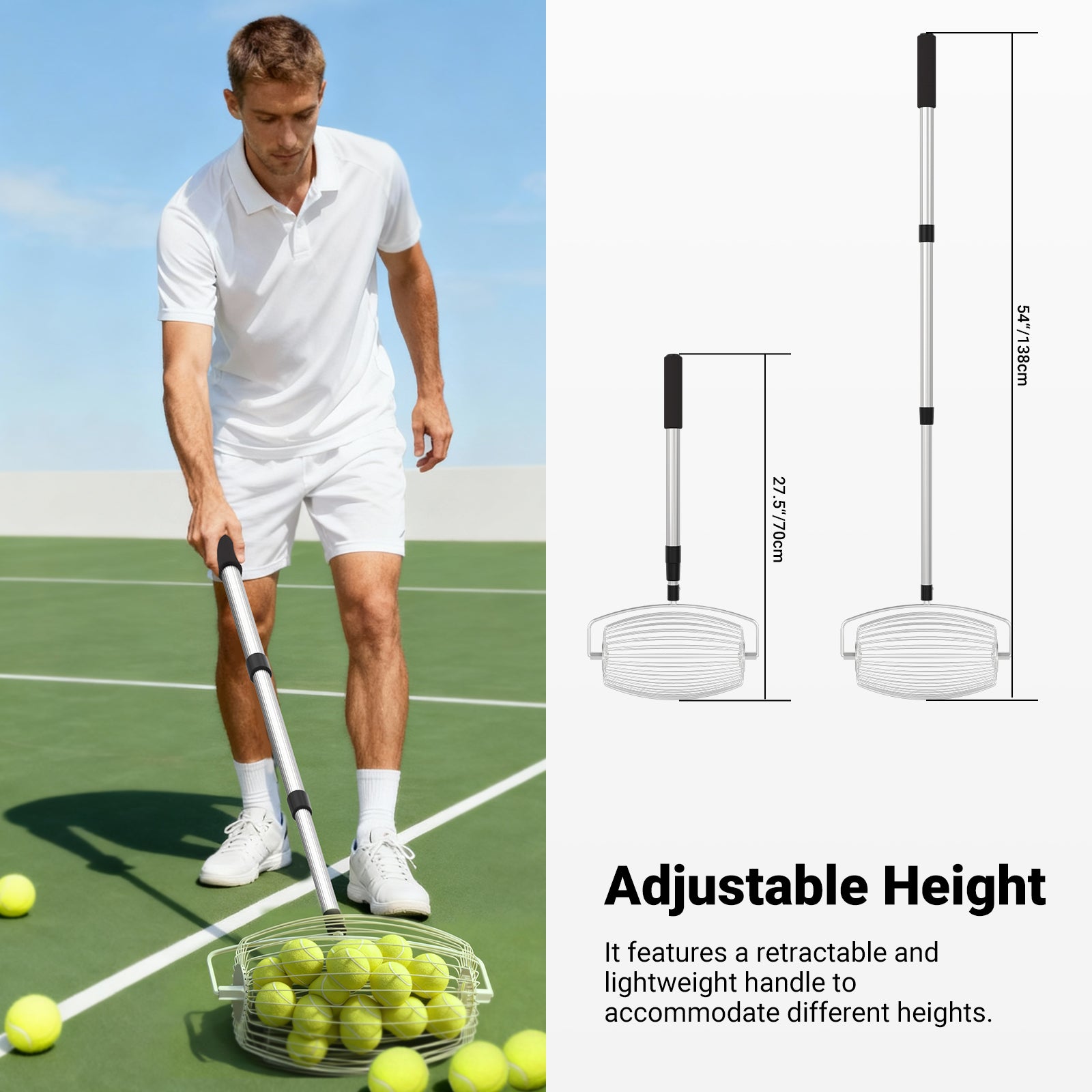 - Adjustable Height for Optimal Comfort- The telescopic handle lets you adjust the tennis ball collector's height from 27.5" to 54.3" (70-138cm) to suit users of various heights without bending over. The handle’s end is covered in soft, nonslip foam for a comfortable grip