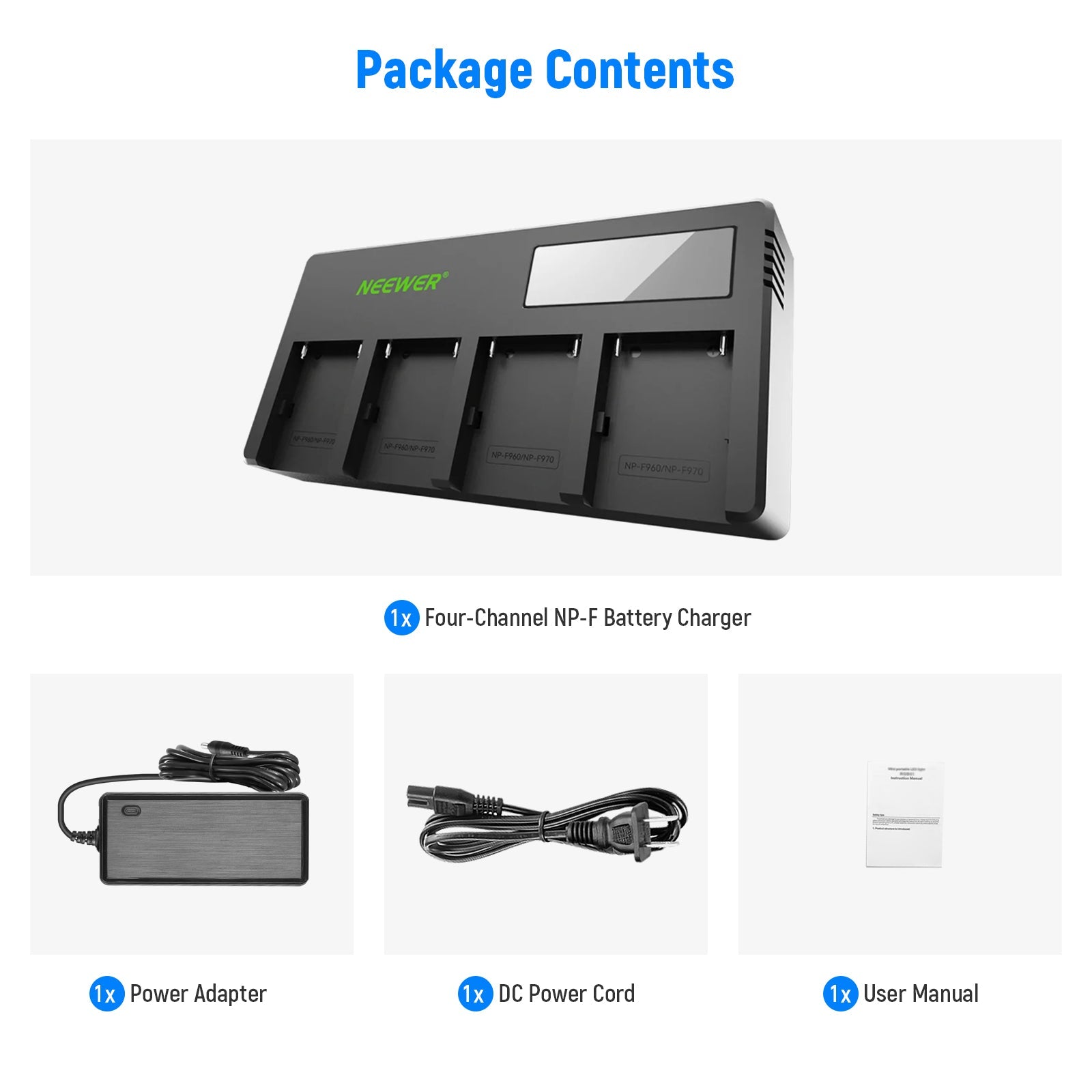 - This Neewer 4-channel charger juices up four NP-F batteries simultaneously. It transfers 2A current when charging 1 or 2 batteries and 1A current when charging 3 or 4.