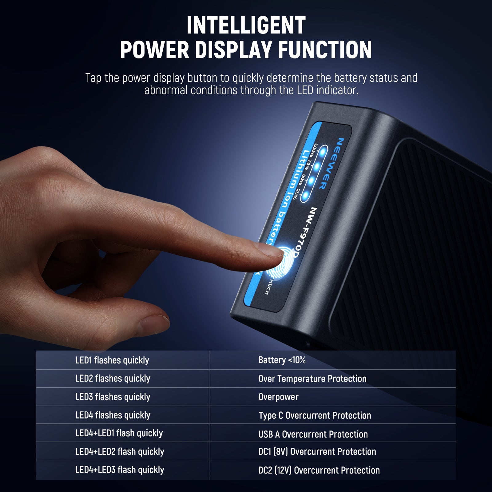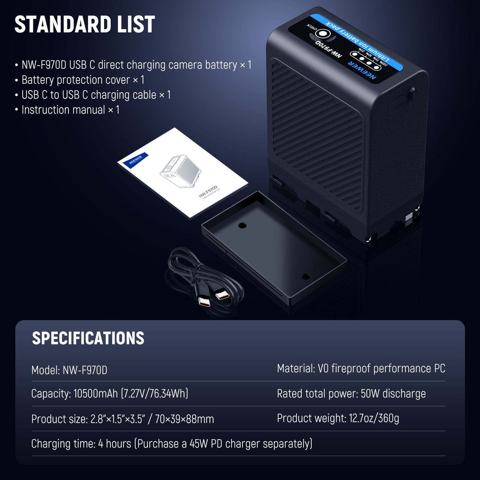 - 10500mAh High Capacity for Continuous Power- With a remarkable capacity of 10500mAh (7.27V/76.34Wh), the NW-F970D ensures abundant battery power for continuous, extended video recording or lighting, functioning as a reliable backup power solution for photographers and filmmakers. Its compact size and lightweight design at just 12.7oz (360g) make it a perfect travel companion for charging your equipment on the go