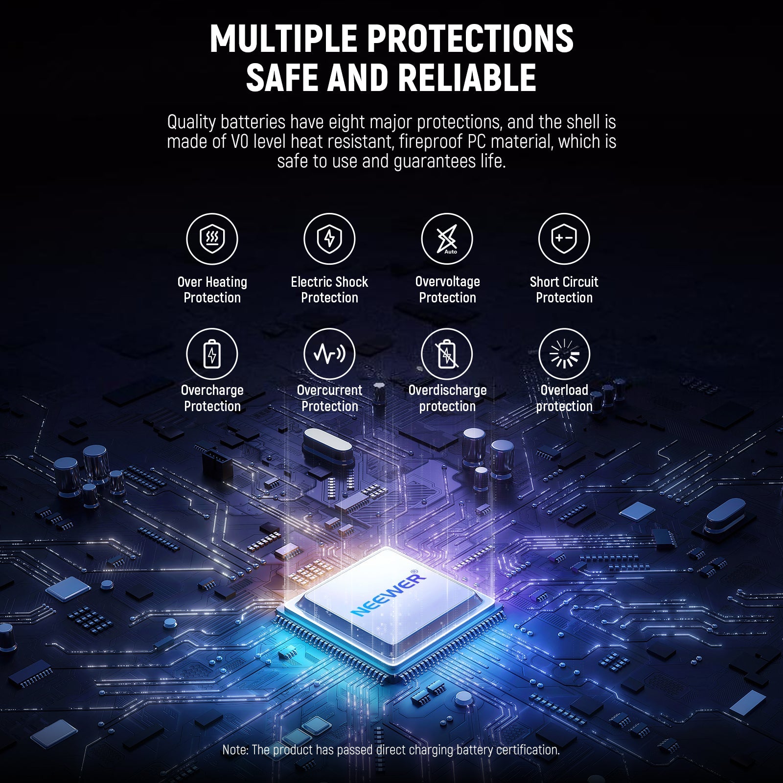 - Top Notch Cell with Multi Protection- Manufactured to the original strict standards, our NP-F970 battery with a premium cell ensures safe and efficient charging & discharging, designed with an advanced protection system against over discharging, overheating, low temperatures, short circuits, etc, to make sure it runs stably in various conditions. The V0 fireproof PC casing is explosion proof for safety and durability