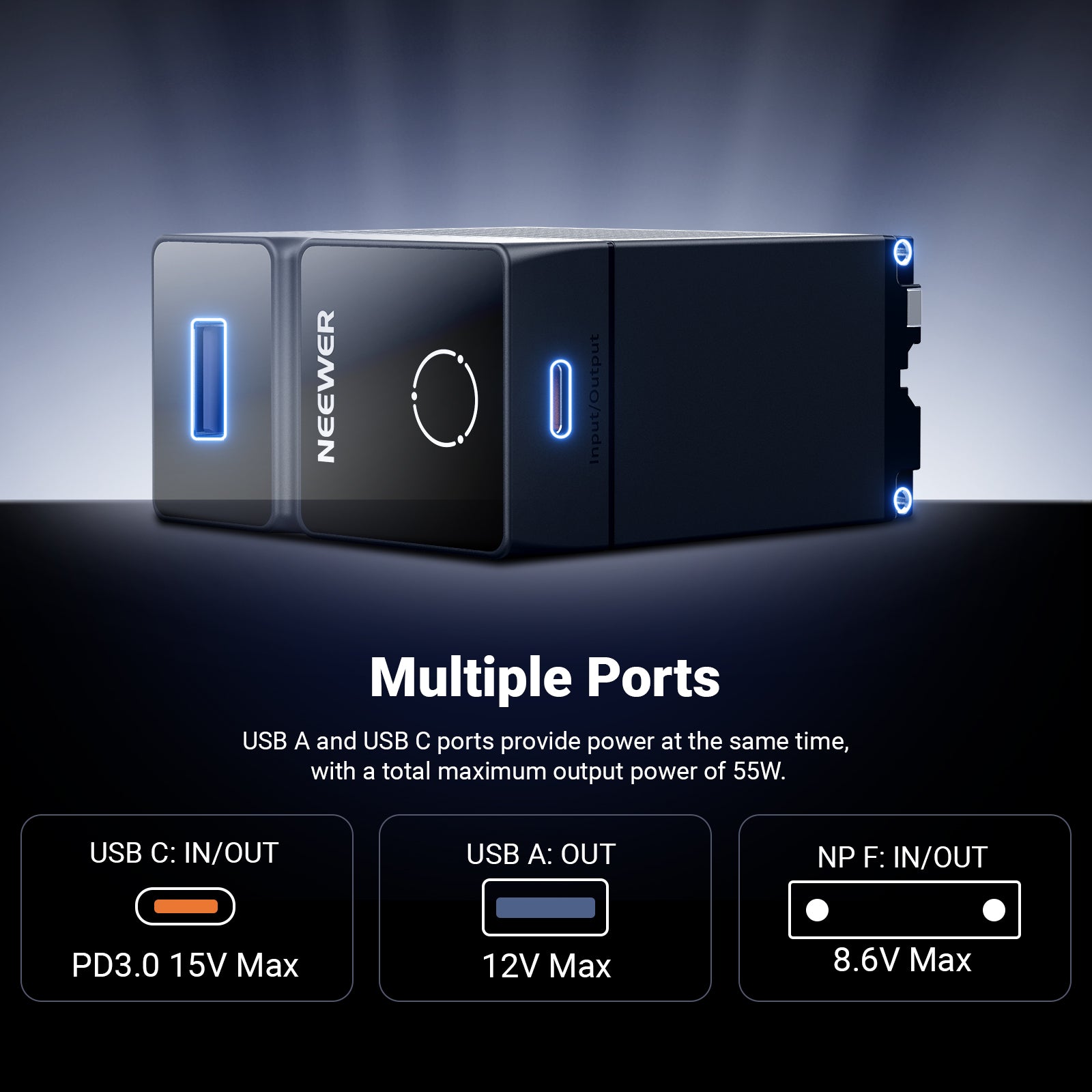 - Dual Port NP-F Battery with 45W PD Fast Charging- Featuring a USB A output (up to 24W) and a bidirectional USB C port (up to 45W), this f970 battery delivers up to 55W when both ports are used together, ideal for powering a camera, monitor, or other gear simultaneously. The USB C port supports bidirectional 45W PD fast charging, enabling rapid device charging and a full battery recharge in just 2.3 hours