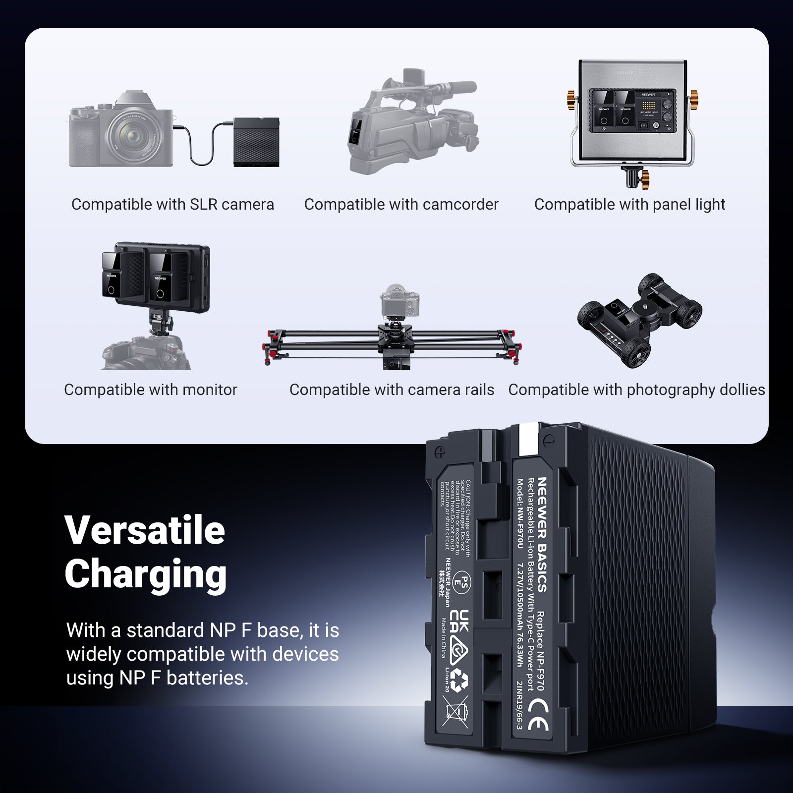 Extensive Device Support- Featuring a standard NP-F mount, this lithium ion NP-F replacement battery is widely compatible with Sony handycam camcorder and devices that use NPF batteries, including cameras, LED video lights, monitors, follow focus systems, camera sliders, and stabilizers, providing a continuous and reliable backup power supply for prolonged shooting sessions