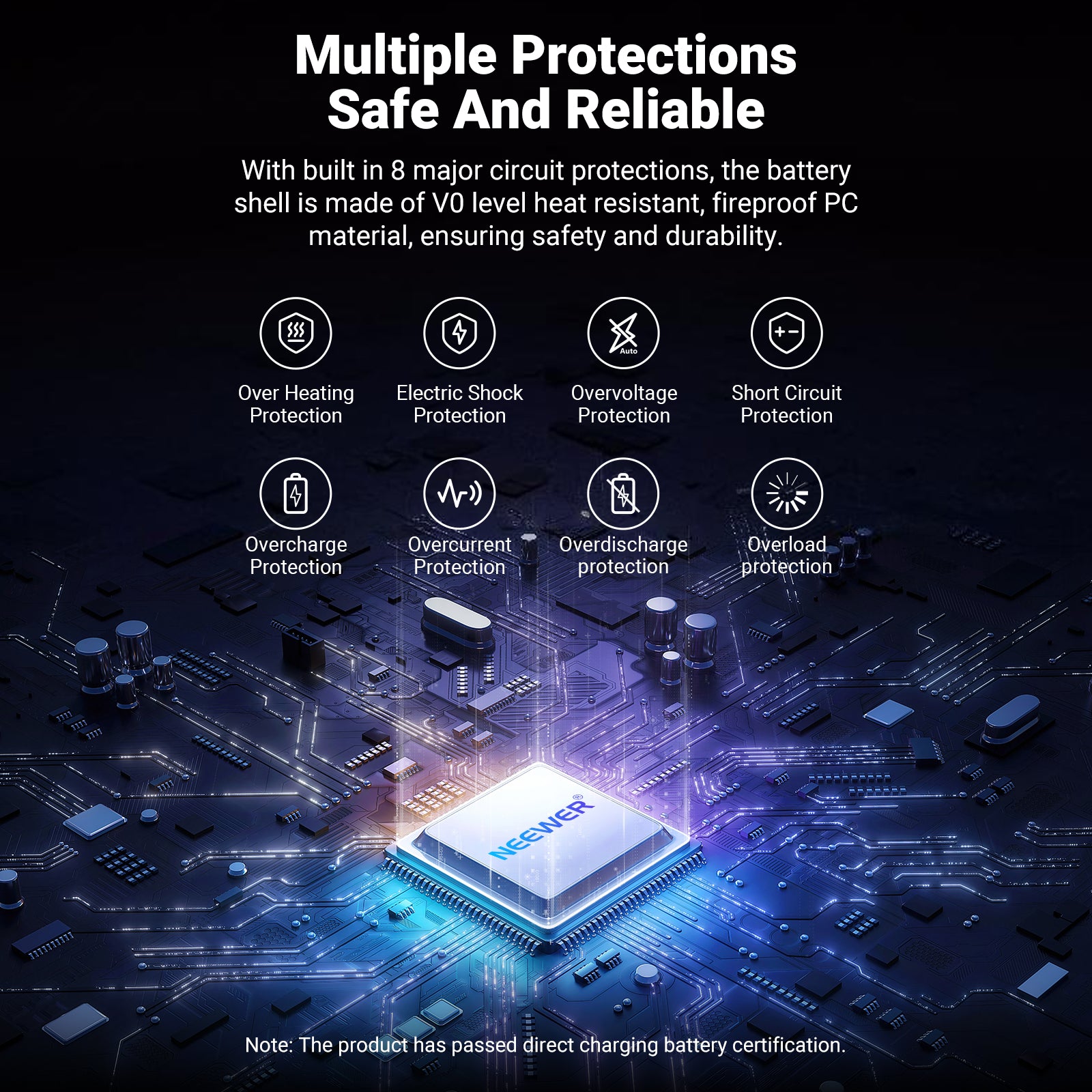 - Advanced Multi Protection Safety System- Built with premium battery cells and a sophisticated protection system, the NP-F replacement battery safeguards against overheating, overvoltage, overcurrent, overcharge, overdischarge, overload, electric shock, and short circuits to ensure battery safety.Note: Do not use it to charge external devices while being recharged itself,as doing so may cause overheating and reduce battery lifespan.