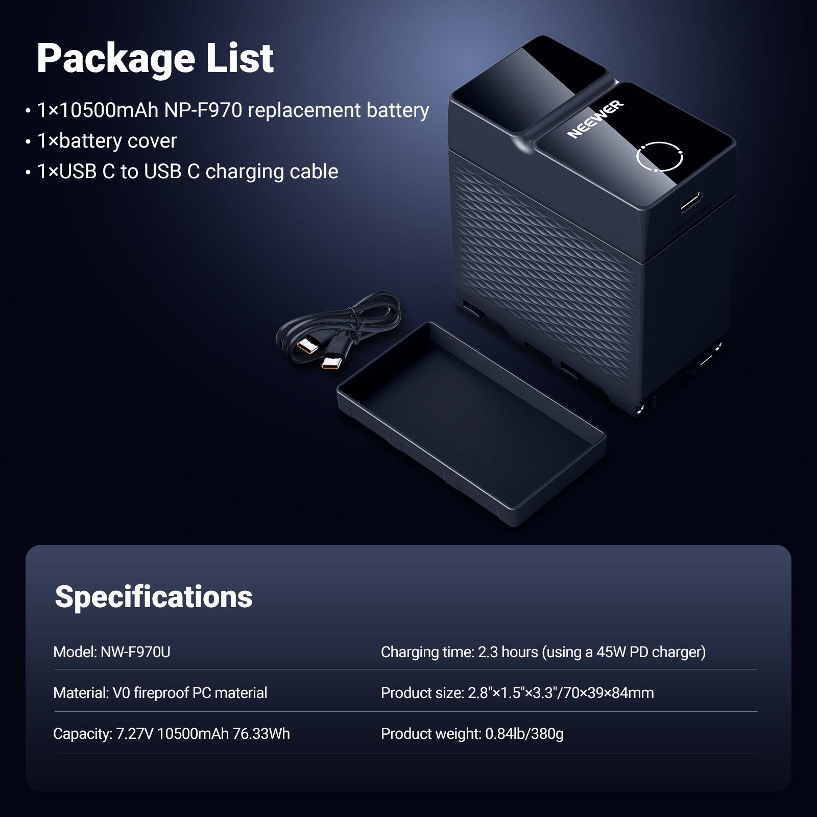 - 10500mAh High Capacity for Continuous Power- NW-F970U is a 7.27V 10500mAh 76.33Wh USB C replacement battery for NP-F970, delivering longer runtime than the original model and extended, uninterrupted power supply for cameras,compatible with Sony FX3 A7 IV A7S III Canon EOS R5 R5 C R6 Panasonic S5 GH5 Nikon Z8, etc. Supporting PD 45W fast charging and discharging.Fully recharges in just 2.3 hours for maximum efficiency,ideal camera accessories for live streaming,video recording,outdoor shooting