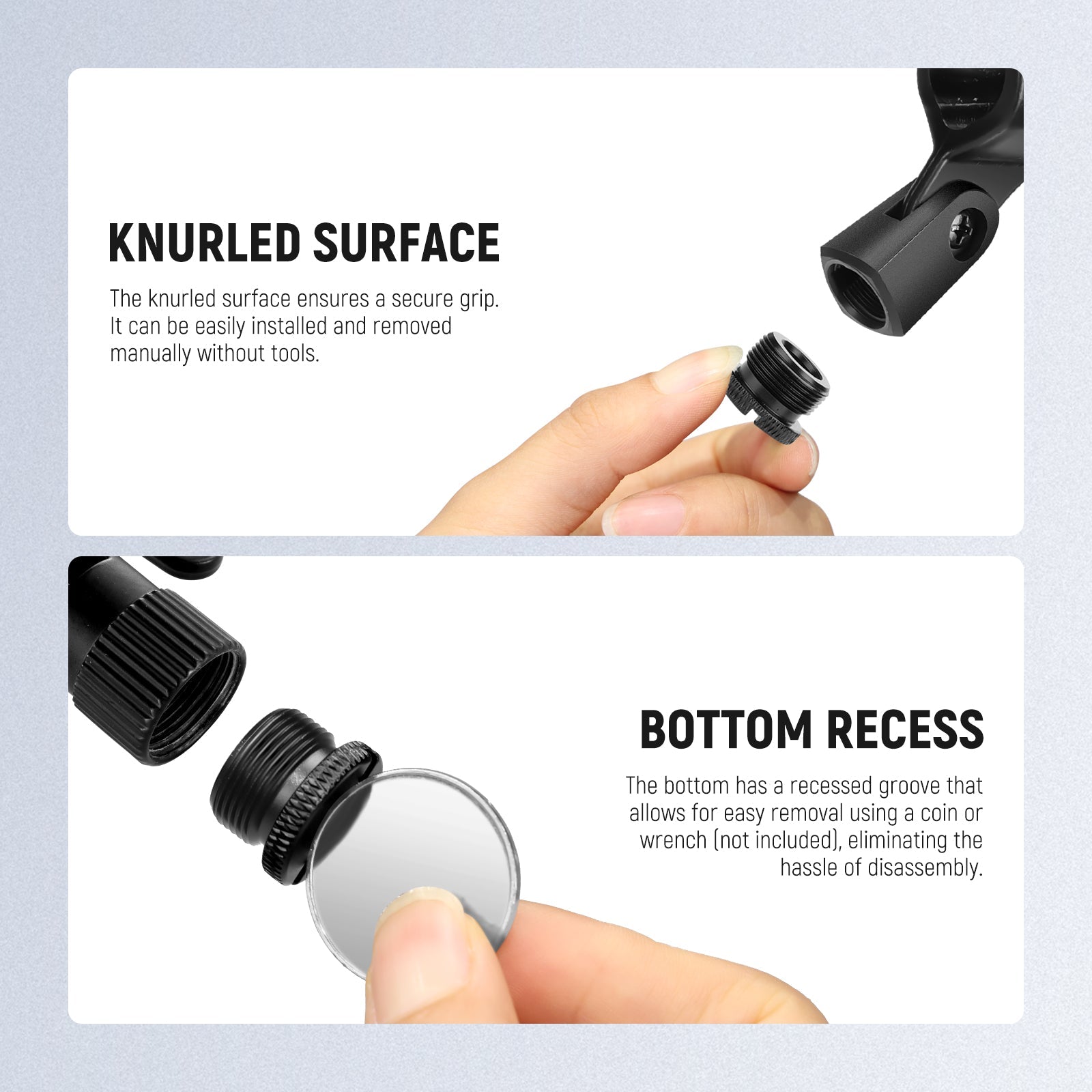 - Slot Design at the Top- The microphone stand buffer tubes and screw adapters are equipped with a threaded mounting interface for easy assembly by hand tightening. The mic stand adapters are also designed with slots at the top, making it easy to disassemble them with a portable coin or wrench (not included), eliminating the frustration of a complicated setup