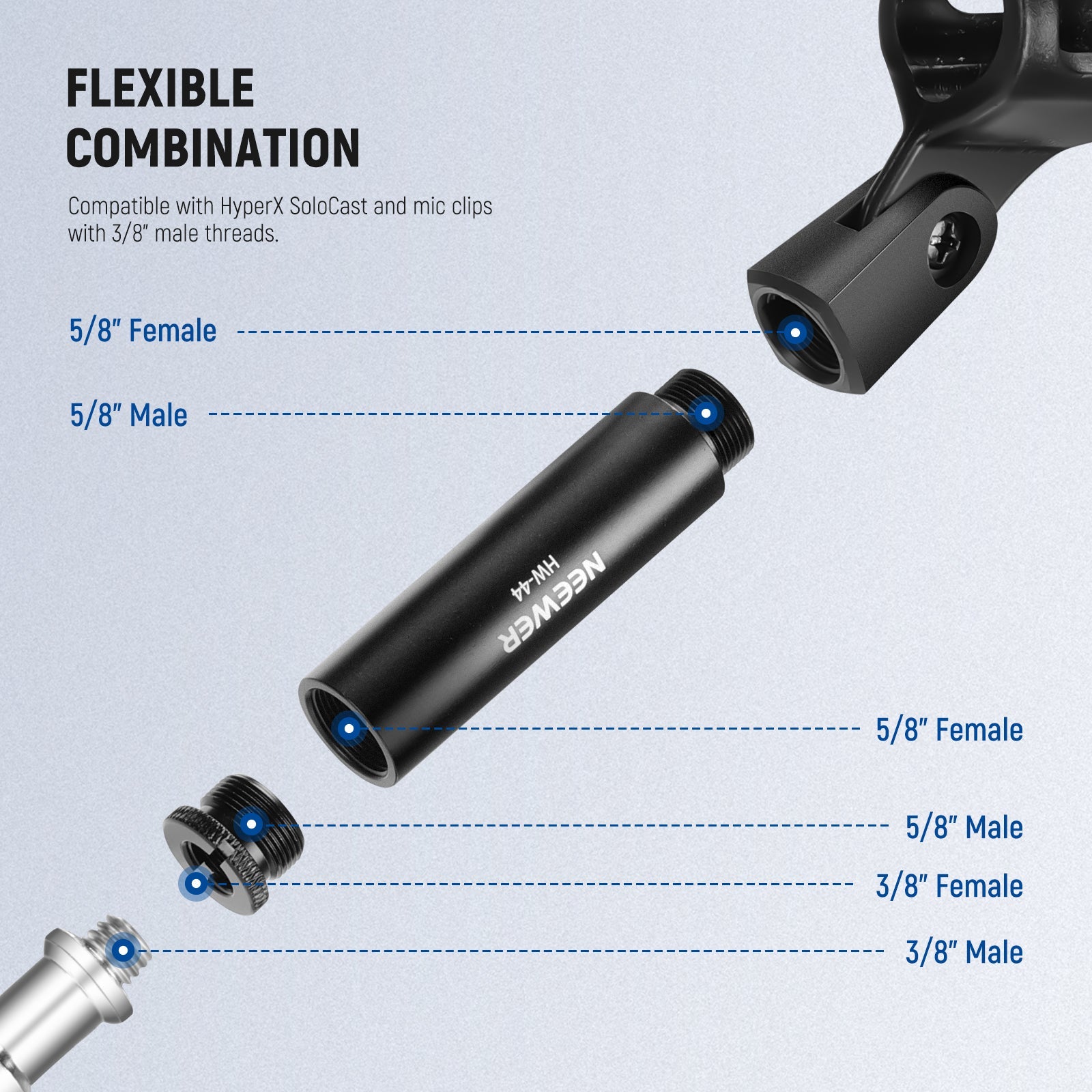 - Wider Compatibility- The mic stand extension tube measures 3 inches/7.6 cm and features a 5/8" male and a 5/8" female thread, compatible with Fifine K669B Shure SM7B HyperX QuadCast Blue Snowball and more microphones with 5/8" male threads. When used with the included adapters, the extension tubes are compatible with HyperX SoloCast and mic clips with 3/8" male threads. Or combined with other adapters for added versatility