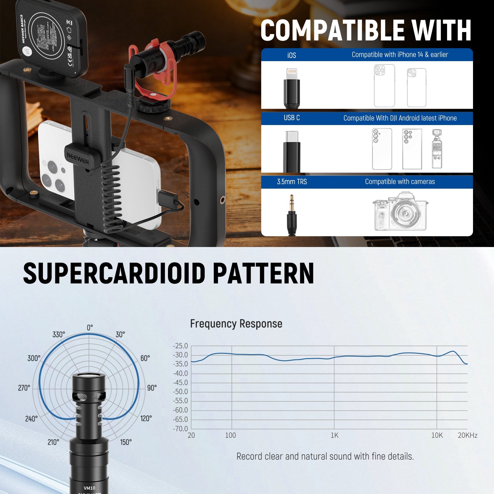 - Small Plug & Play Microphone- Directly plug the mini portable VM10 mic into your device and record professional sound―no batteries are needed. It features a supercardioid polar pattern for clear audio pickup within 1.6'-3.3'/50-100cm. The included OTG and 3.5mm TRS cables are compatible with iPhone, iPad, Android smartphones, and cameras for vlogging, video recording, streaming, podcast. The shock mount and windscreens help reduce unwanted noise