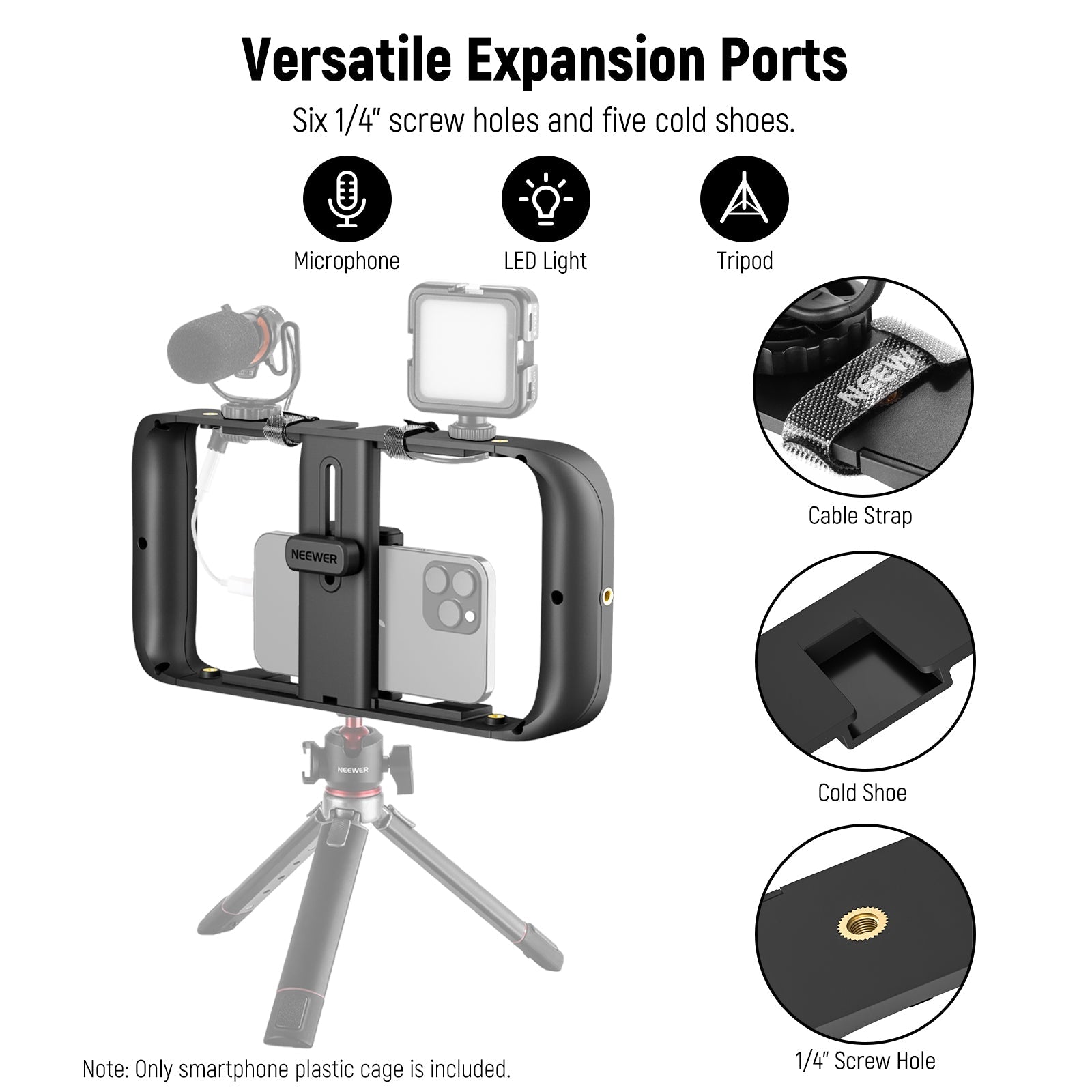 NEEWER phone cages provide enhanced stability and flexible mounting options for mobile photography and videography. By holding your smartphone in a rigid frame, they help reduce handheld shake and allow more controlled shooting, while offering multiple mounting points for accessories such as lights and microphones.