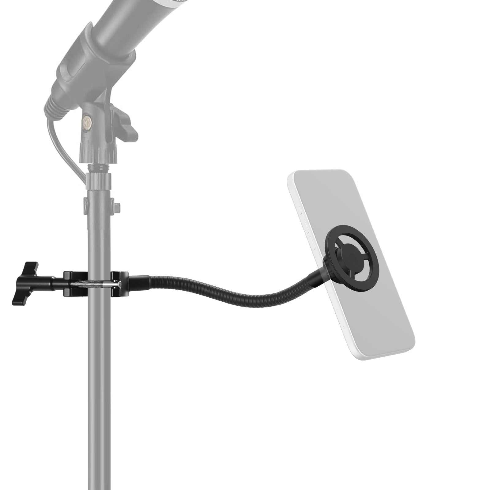 - Phone Stand Holder with Flexible Arm- The mic stand phone mount features a flexible arm and an O type clamp, all made of robust aluminum alloy, to securely attach your phone to the microphone stand for excellent stability. Its flexible tube and metal ball head allow for smooth adjustments, while the phone holder firmly grips your device, ideal for vlogging, live streaming, audio and video recording, podcast, and more videography