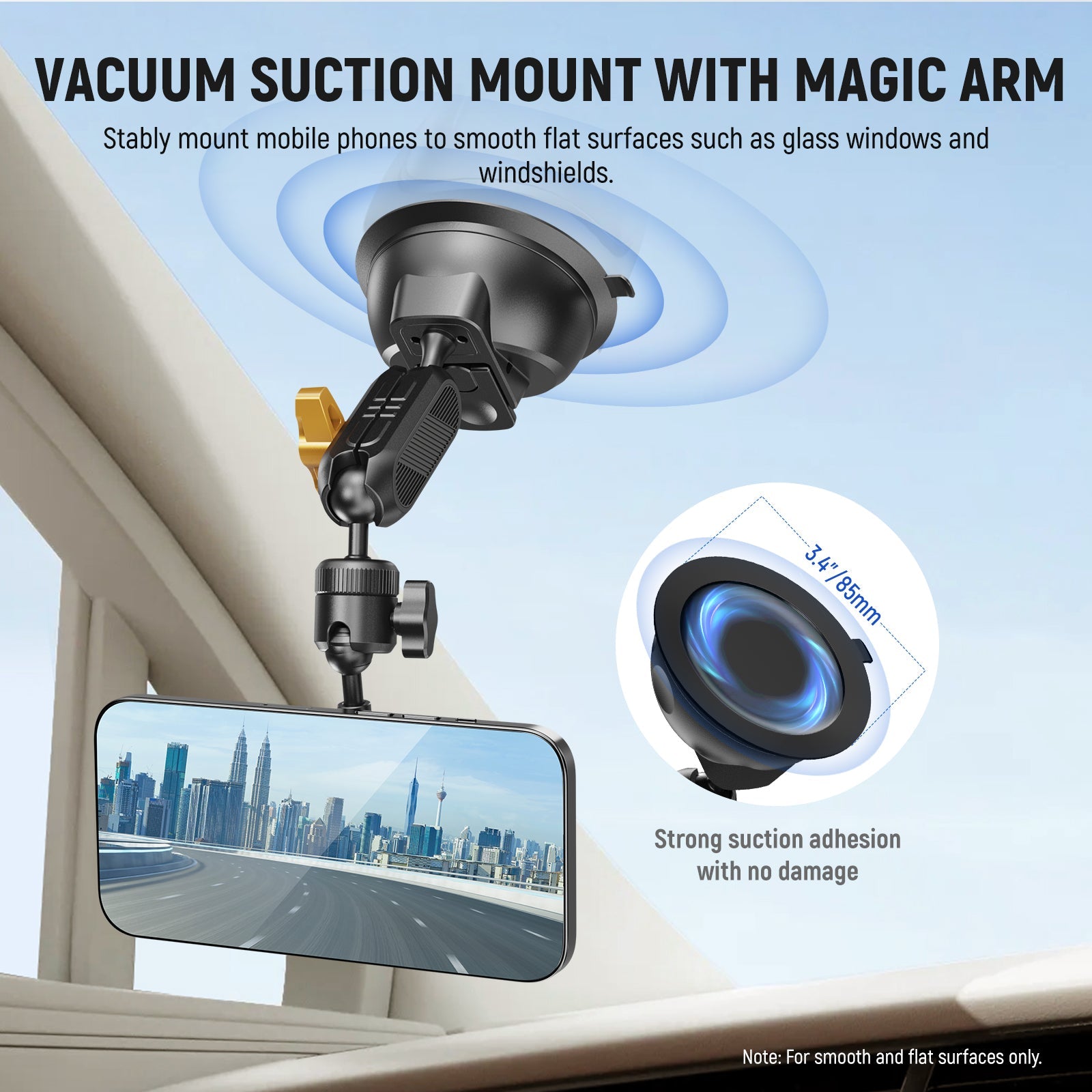 - Powerful Suction Cup with Magic Arm- The 3.35"/85mm Air Pump Vacuum Suction Cup with a flexible magic arm holds firm to any smooth, flat, and nonporous surfaces like the car windshield, window, dash, or tile, allowing your smartphone achieve any desired angle for POV video recording and using in various scenes like recording funny road trip footage, watching Netflix movies as a shower phone mount, or as a magnetic phone holder for gym