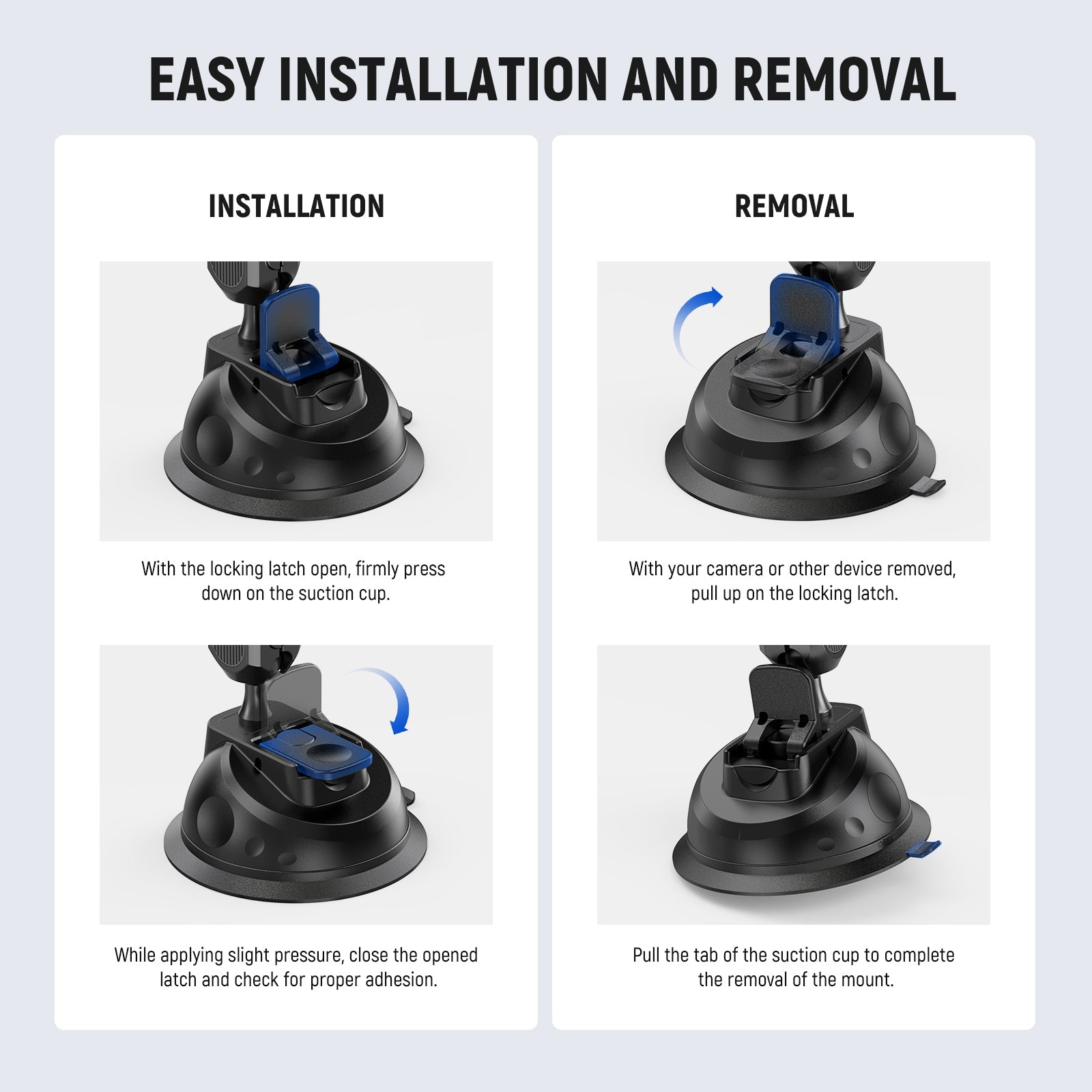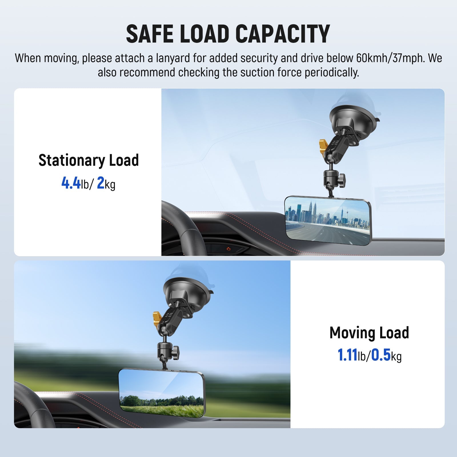 - Quick Lock and Go with Pressure Buckle- Simply press the latch to unleash superior suction power that effortlessly supports your phone with a moving load capacity of 1.1lb/0.5kg and stationary load capacity of 4.4lb/2kg, ensuring safe and quick setup and easy damage free removal. Note: Only for smooth, clean surfaces like car windshields, windows, dashboards, tiles, etc. Avoid rough surfaces.