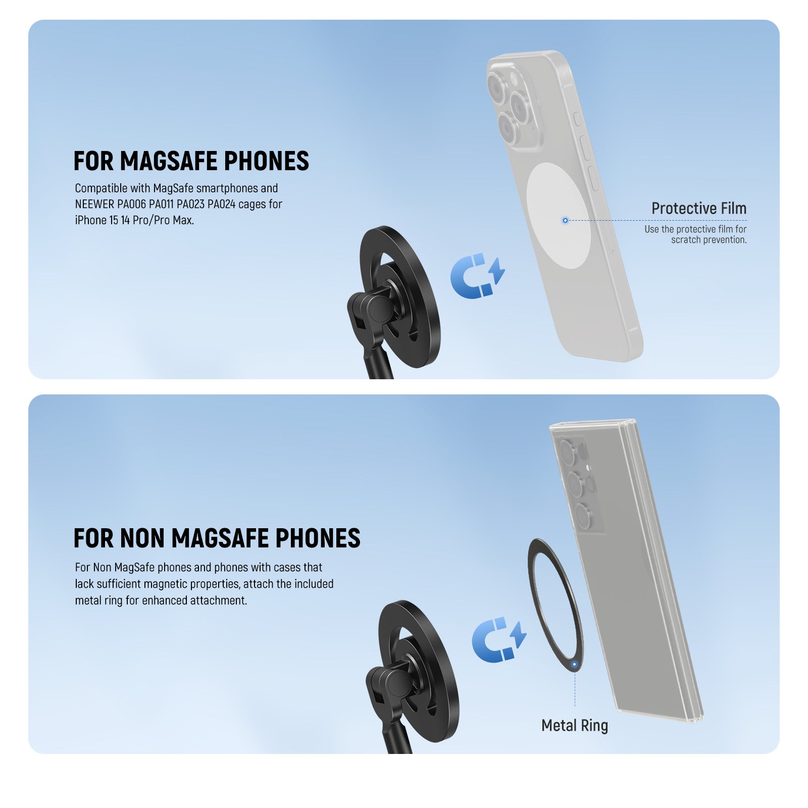- Versatile Magnetic Phone Holder- Our suction phone mount comes with a magnetic phone holder, compatible with MagSafe iPhone 15 14 13 12 series. The included 2 metal rings can be attached to a phone case for smartphones with insufficient magnetic properties, making this photography accessory compatible with Samsung Galaxy S24 S23 S22 Ultra Google Pixel 8 7 Pro Huawei P60 Mate60 Pro, and other Android cellphones. Firmly hold your phone anywhere you want for smooth and reliable shooting