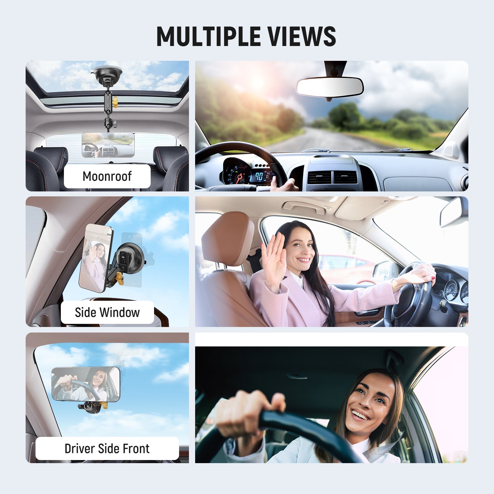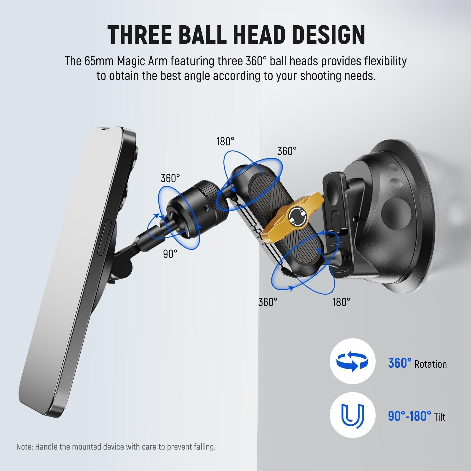 - Flexible Shooting Angle- The 2.6"/65mm magic arm of this essential kit for POV recording features three 360° swivel ball joints for multi angle adjustment and a U shaped slot for 90° vertical tilt. Whether you're vlogging, live streaming, or shooting interviews, this phone camera car mount offers endless possibilities to enhance the quality of your work
