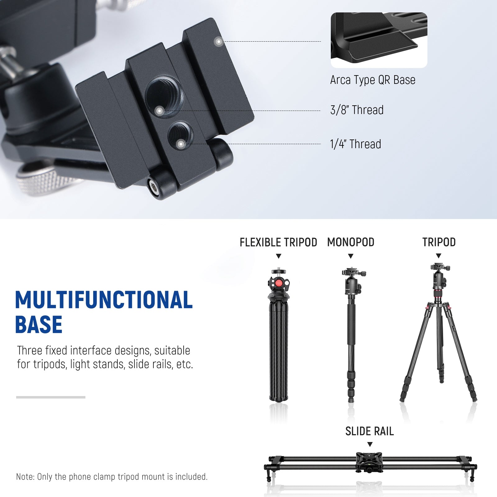 - Arca Type Base for Tripod Mounting- Designed with an Arca type base, the smartphone tripod mount can be attached to a compatible quick-release plate, or it can mount on a tripod, monopod, light stand, handgrip, and other supports via the 1/4” and 3/8” threads