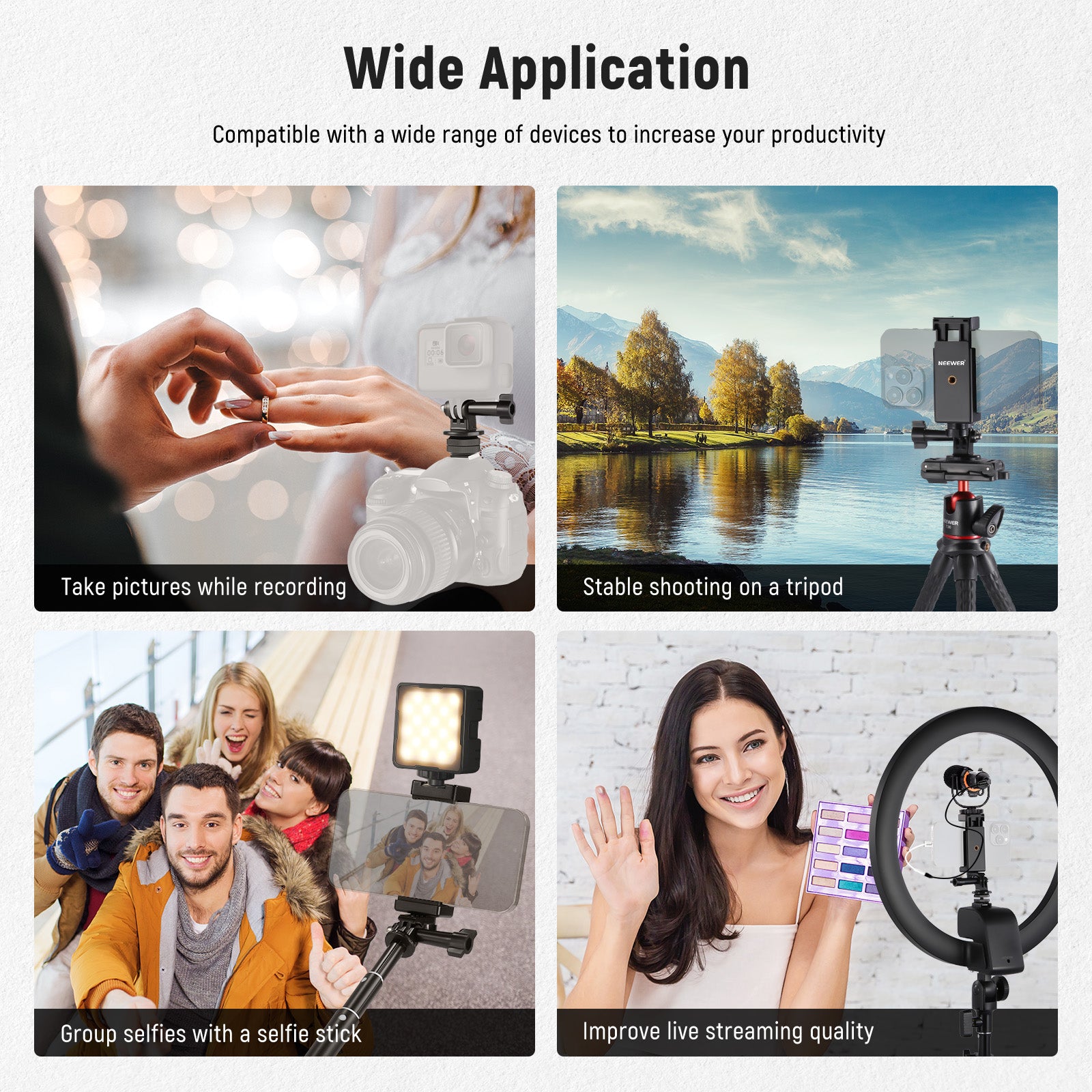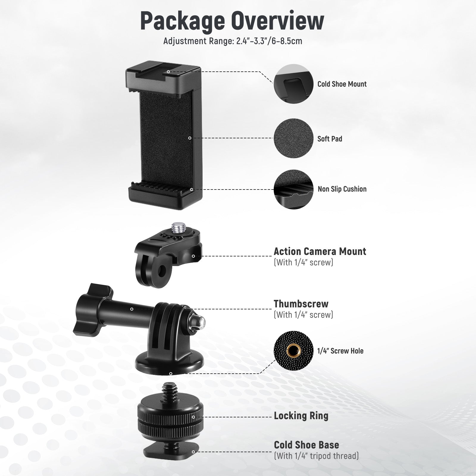 - The kit includes a cold shoe mount, an action camera adapter, and a universal phone holder, compatible with GoPro Hero 11 10 9 series action cameras or smartphones on your DSLR or ring light