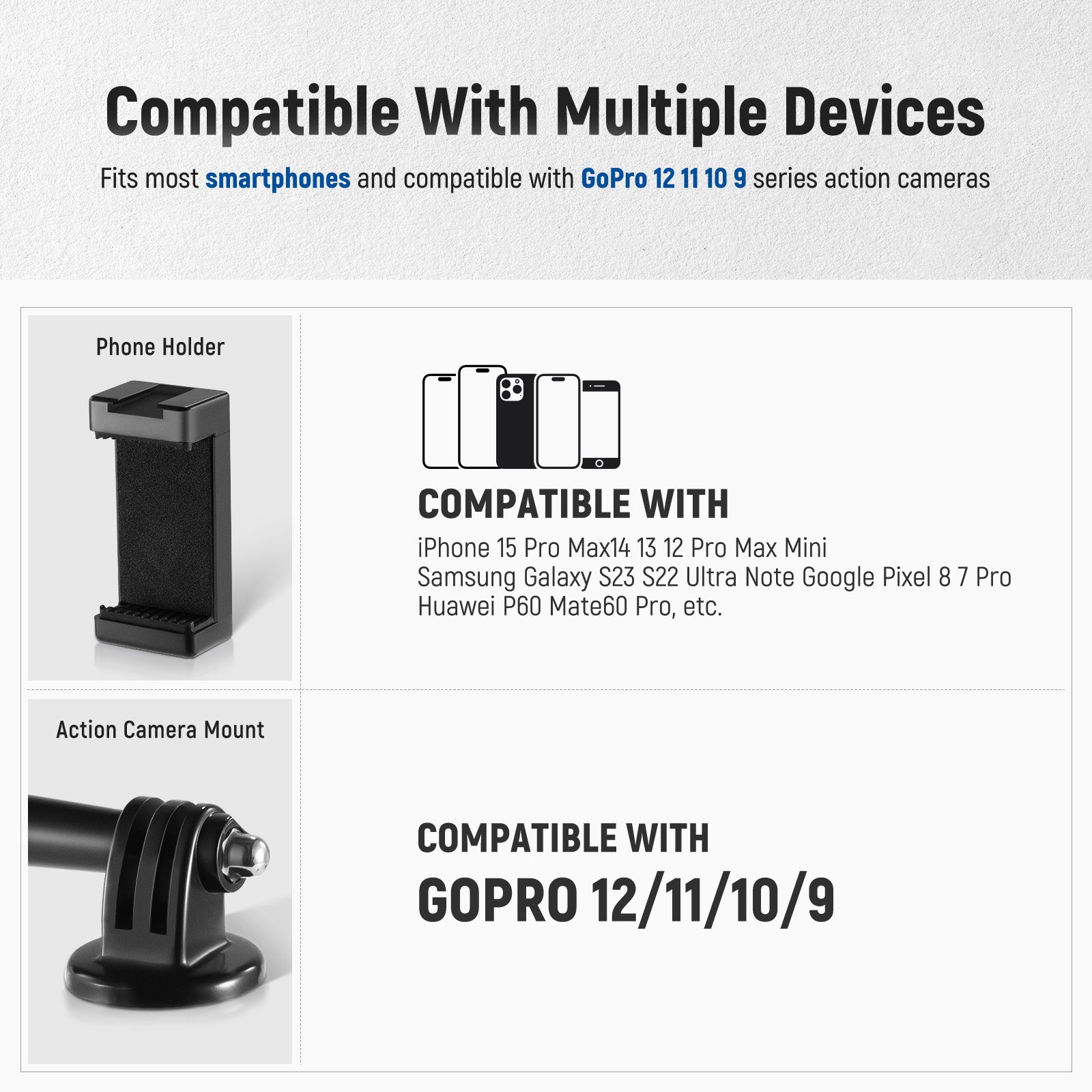 - Compatible with iPhone 17 16 15 14 Pro Max X XR Samsung Huawei GoPro Hero 11 10 9 8 7 6 5 DJI OSMO Action and other devices within the width of 2.4-3.3 inches (6-8.5 cm)