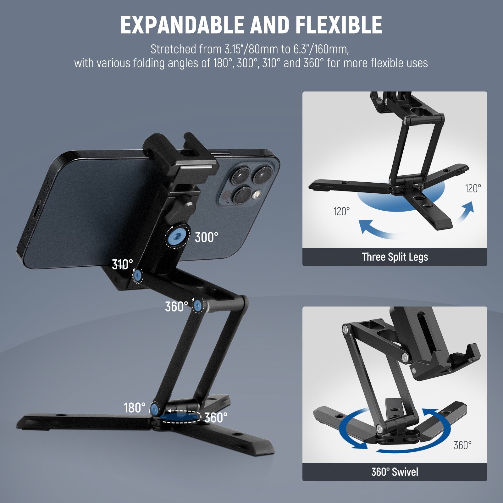 • Tri Fold Expandable & Flexible Angles- The upgraded tri fold design includes an additional spread height and a larger grip for convenience. The length can be stretched from 3.15"/80mm to 10.24"/260mm, the max expanded height is 7.1"/180mm, and each folding angle supports 310°, 360°, 180° of adjustment. With a 360° rotating pivot at the bottom, it allows for easy phone camera locating in overhead, upward, vertical, and other shooting positions