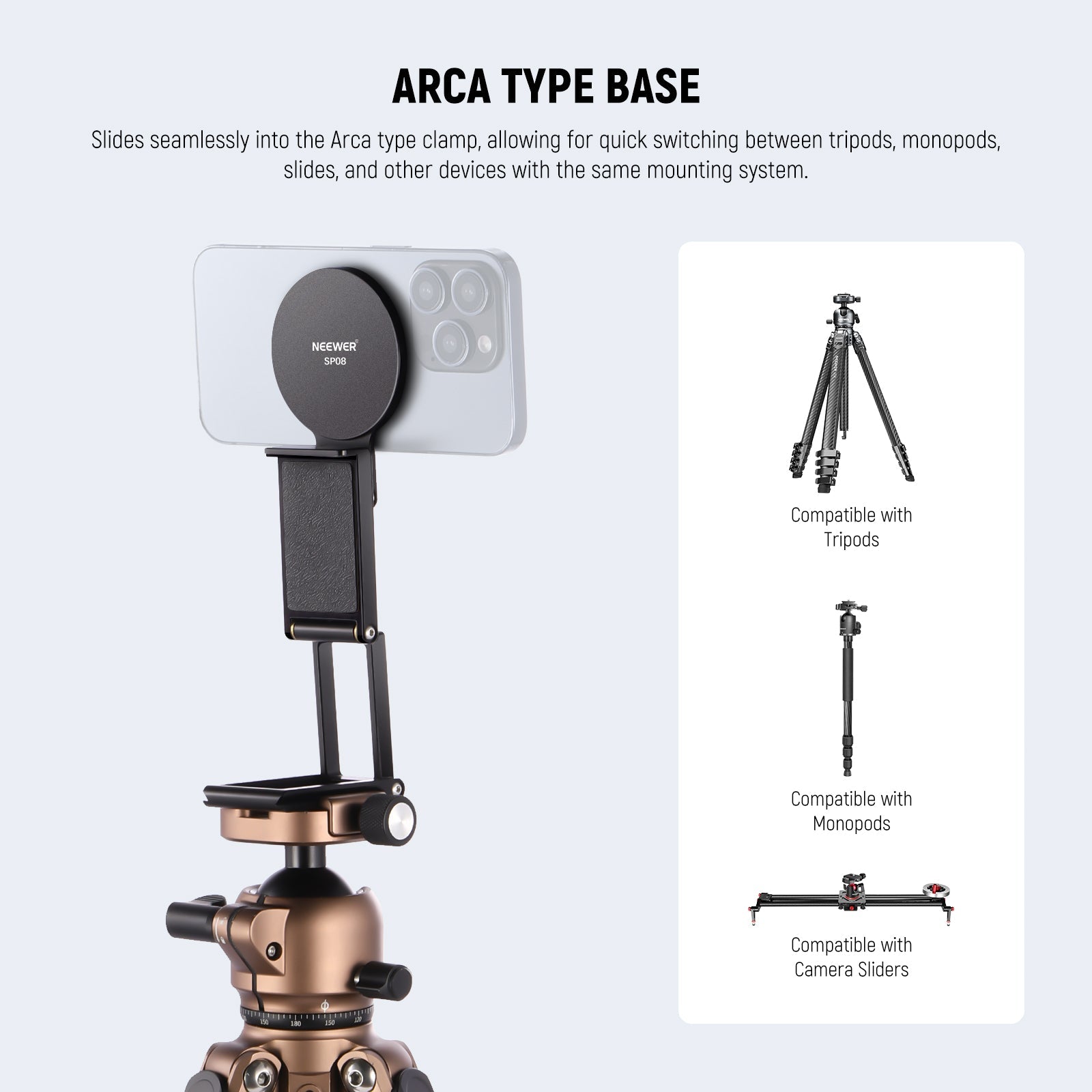 - Tri Fold Design & Arca Type Base- The desk camera mount boasts a tri fold design that elevates your phone by 7.3"/185mm for a more comfortable viewing experience on the desktop. The phone mount also features an Arca type base that seamlessly slides into an Arca type clamp, enabling swift switching among tripods, monopods, sliders, and other devices with the identical mounting system