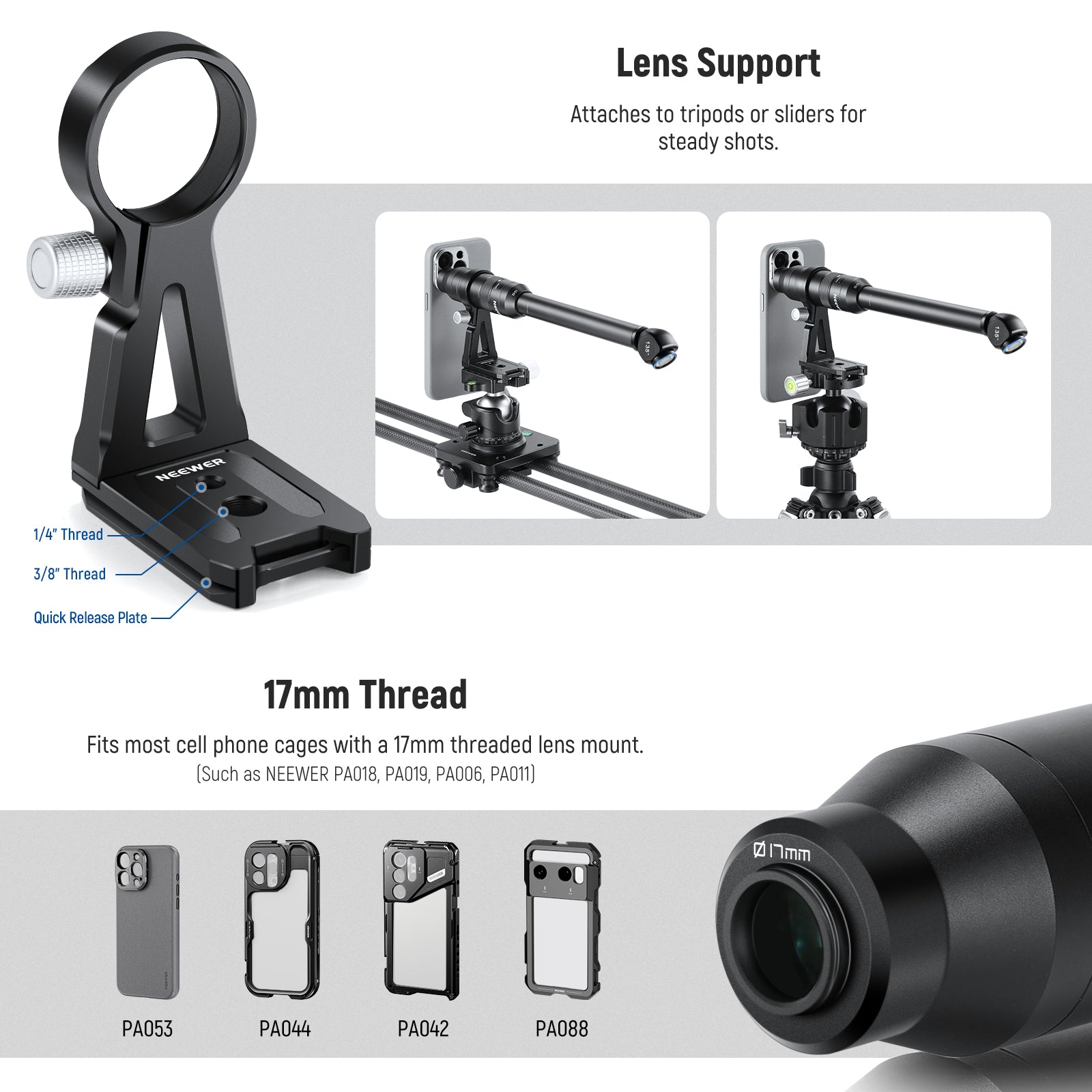 NEEWER phone lenses are crafted with a durable aluminum alloy frame that resists rust and scratches. These lenses ensure accurate color reproduction for sharp and vibrant videos and photographs. Our collection includes macro probe lenses, wide-angle phone lenses, and more. Choose a professional phone lens to elevate your mobile photography.