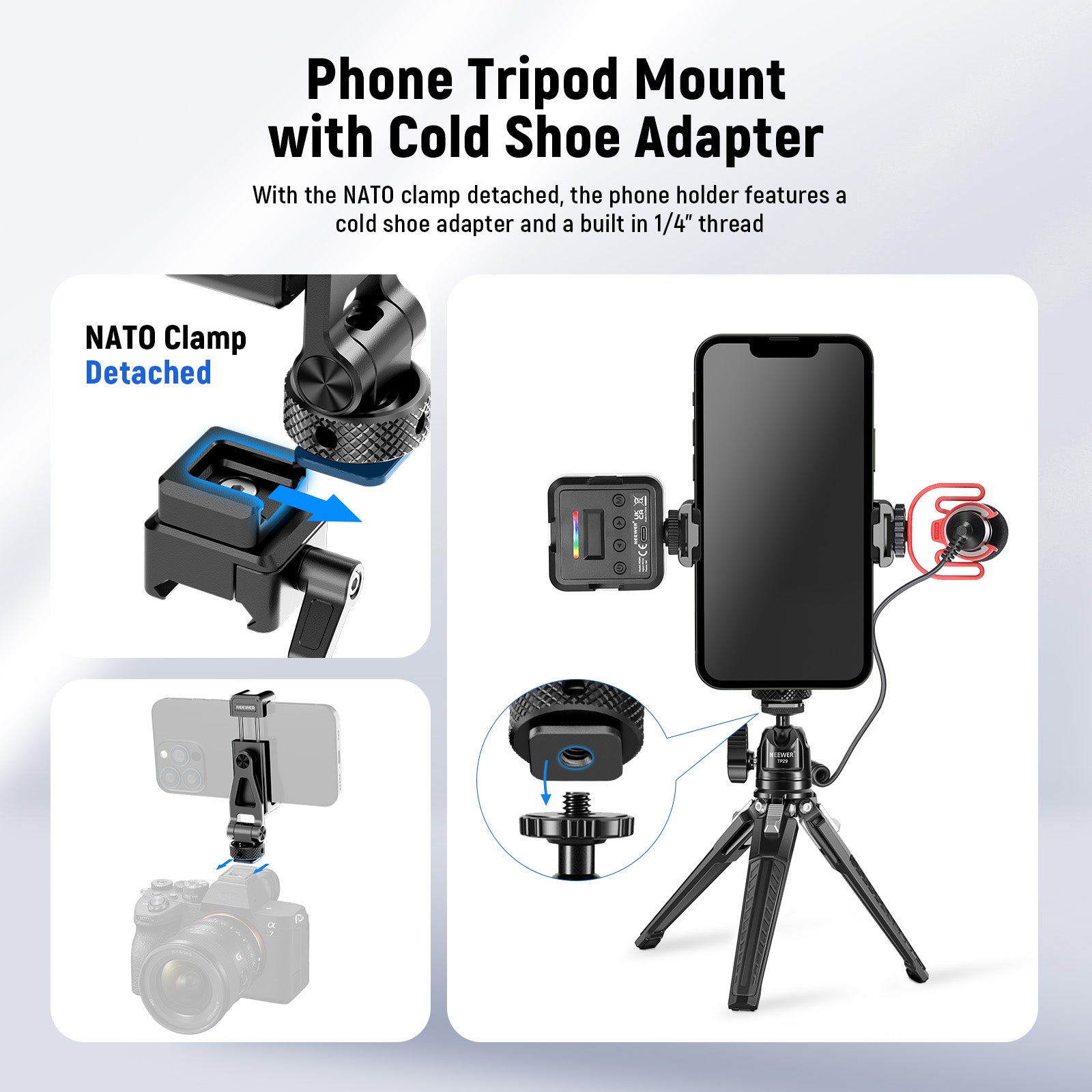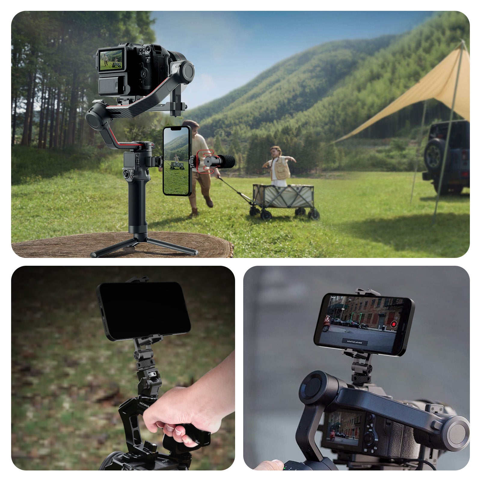Dedicated and universal phone cages/cases, handles, holders, dollies, tripods, and other accessories for mobile photography.