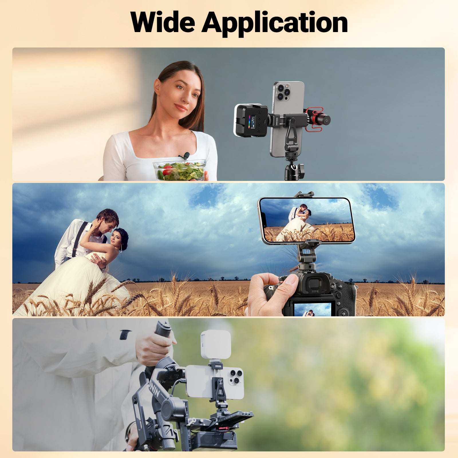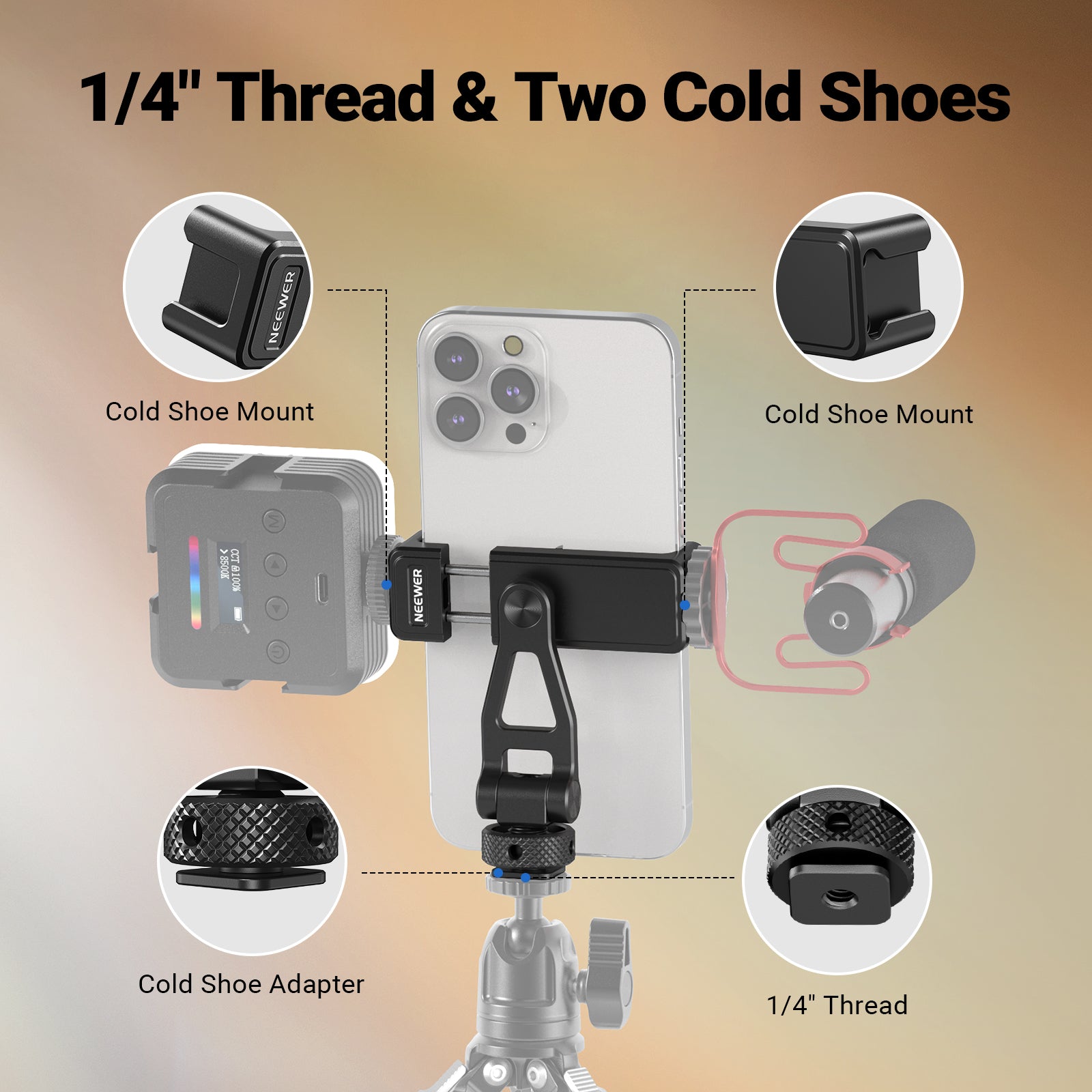 - 1/4" Thread & Two Cold Shoes- Easily connect to tripods, handgrips, selfie sticks, camera sliders, or dollies via the 1/4" thread. The top cold shoe bracket accepts LED video lights and microphones for accessory expansion while the bottom cold shoe adapter attaches to camera cages, top handles, and gimbal sling handles