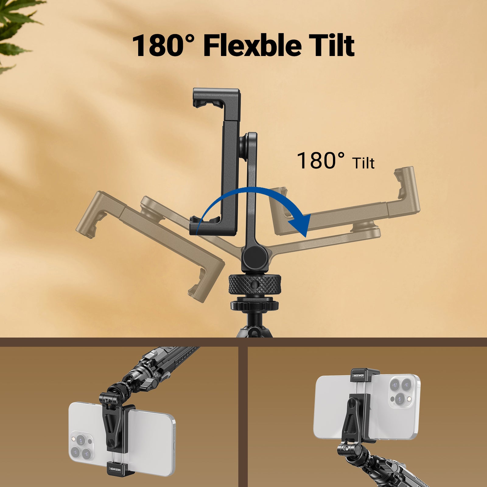 - 180° Flexible Camera Positions- Equipped with a 180° hinge, this phone holder tripod mount offers flexible camera positions for overhead and low angle shots