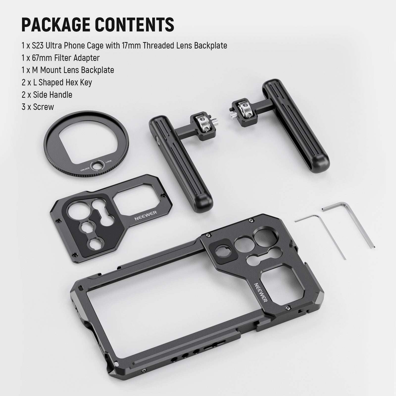 - 1 x S23 Ultra Phone Cage with 17mm Lens Backplate