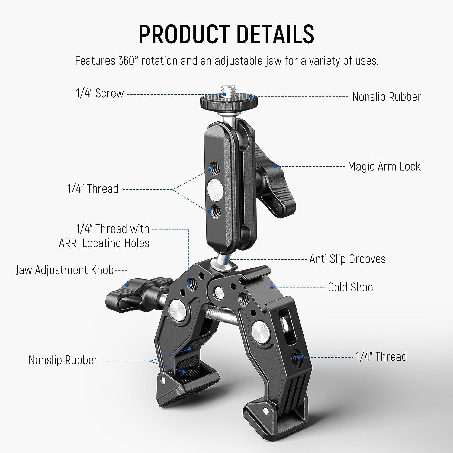 - Multiple Mounting Points- With 1/4" threads, 3/8" threads, ARRI locating points and a built-in cold shoe mount , the super clamp and magic arm can connect numerous accessories like a monitor, shoulder rig, and camera cage. A built-in cold shoe mount for quick mounting of LED fill lights, microphones, and more (not suitable for on-camera speedlite flashes)