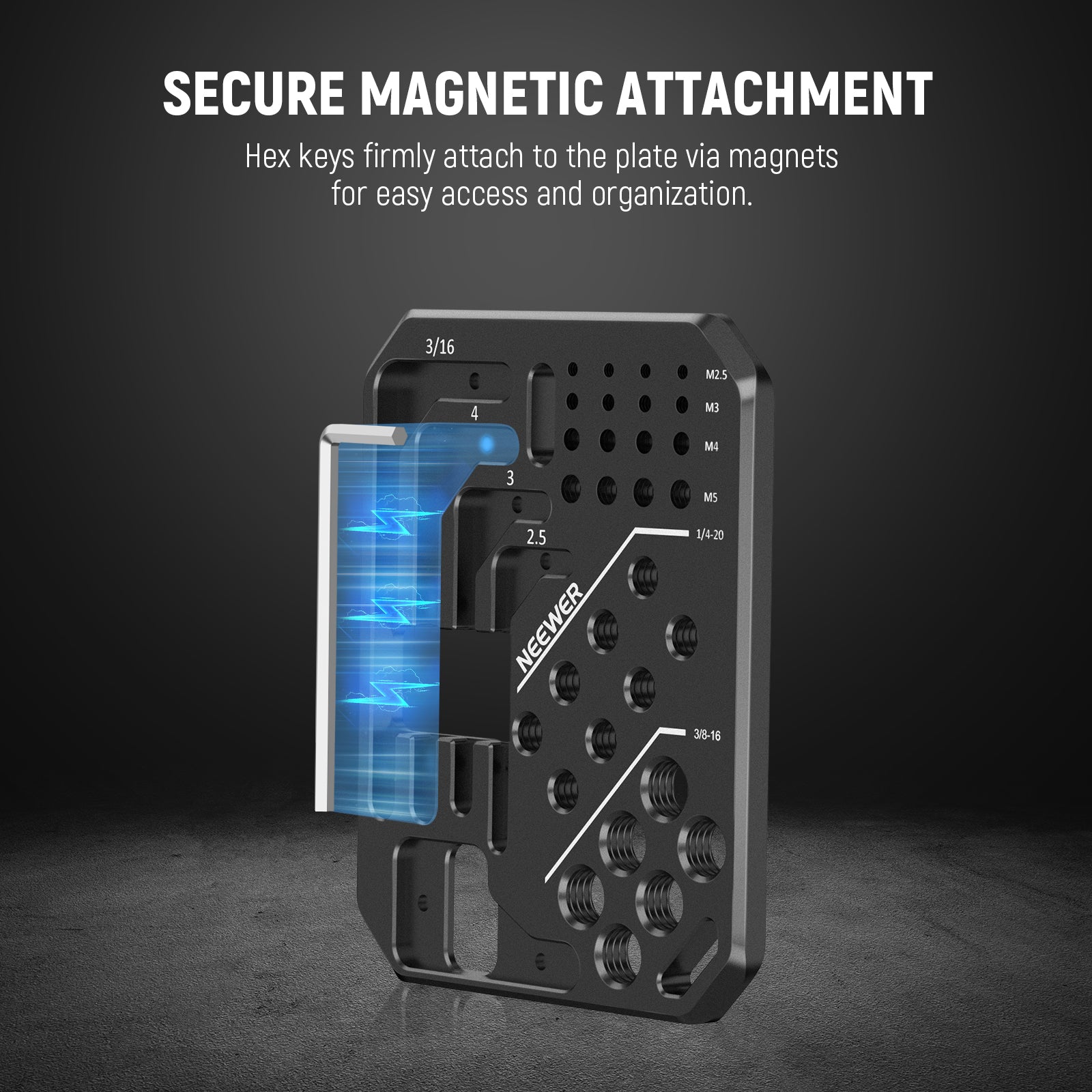- Thread/Magnet Design- Use hex keys to securely fasten screws in their own threaded holes. Hex keys can firmly attach to the plate without falling off through magnets. The storage plate can store up to 30 screws and arrange them neatly according to the thread size. Two 1/4" screw holes and four 3/8" screw holes are left empty for you to store your own extra screws