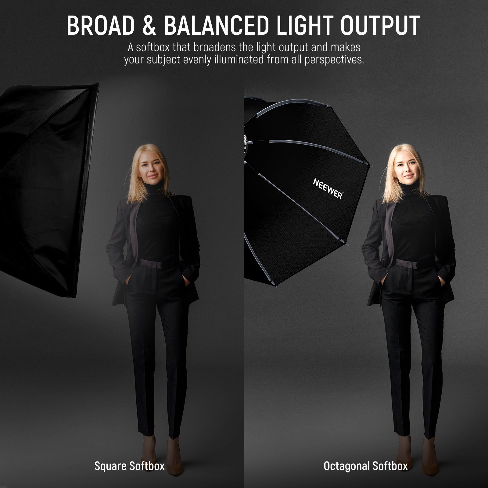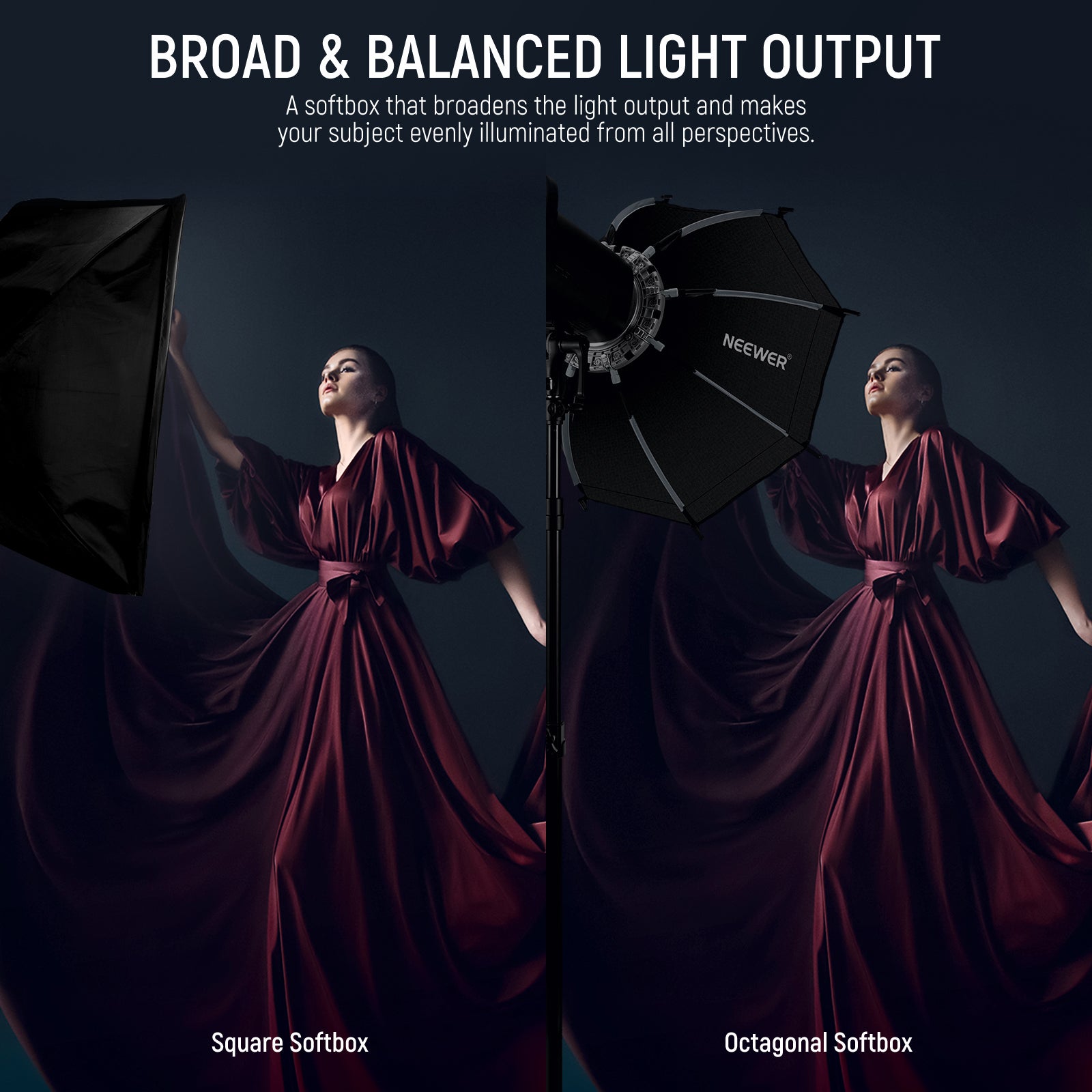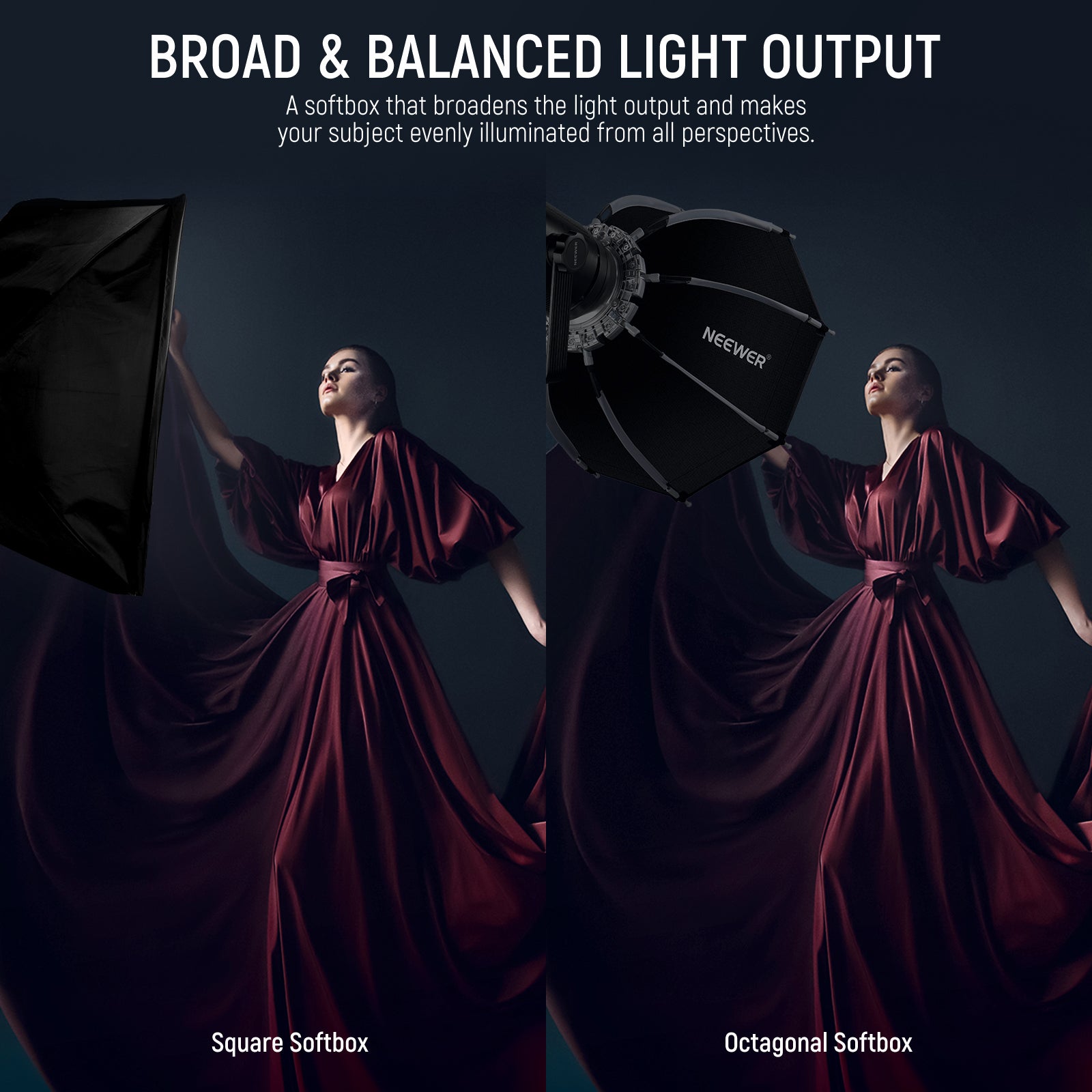 NEEWER offers various softboxes, including parabolic, octagonal, lantern, rectangular softboxes, etc. These softboxes feature a quick-release design and excellent portability. They can give you better even lighting and are perfect for shooting portraits or events such as weddings, proms, or corporate events on location. Choose a good softbox to elevate your photography to the next level.