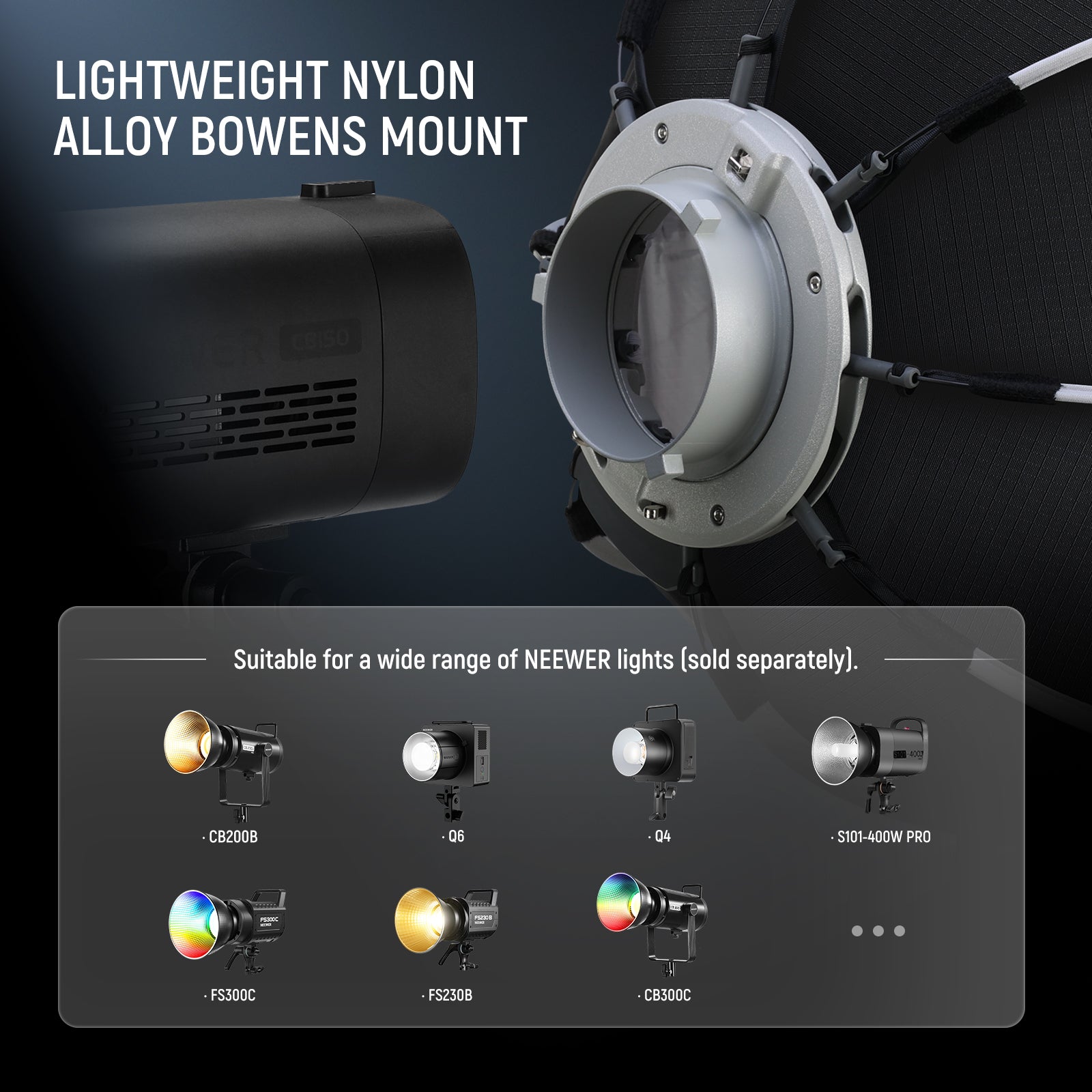 - Attach Via Bowens Mount- Connecting via Bowens mount, the softbox is compatible with Aputure 120D, compatible with Godox SL60w, compatible with SmallRig RC 120D RC 120B and NEEWER Q4, AS600B, CB300B, CB300C, CB200, CB200B, CB60, CB60B, S101-300W PRO, S101-400W PRO, S102-400W PRO, Vision 4, Q300, and other studio strobe lights and continuous LED video lights with Bowens mount