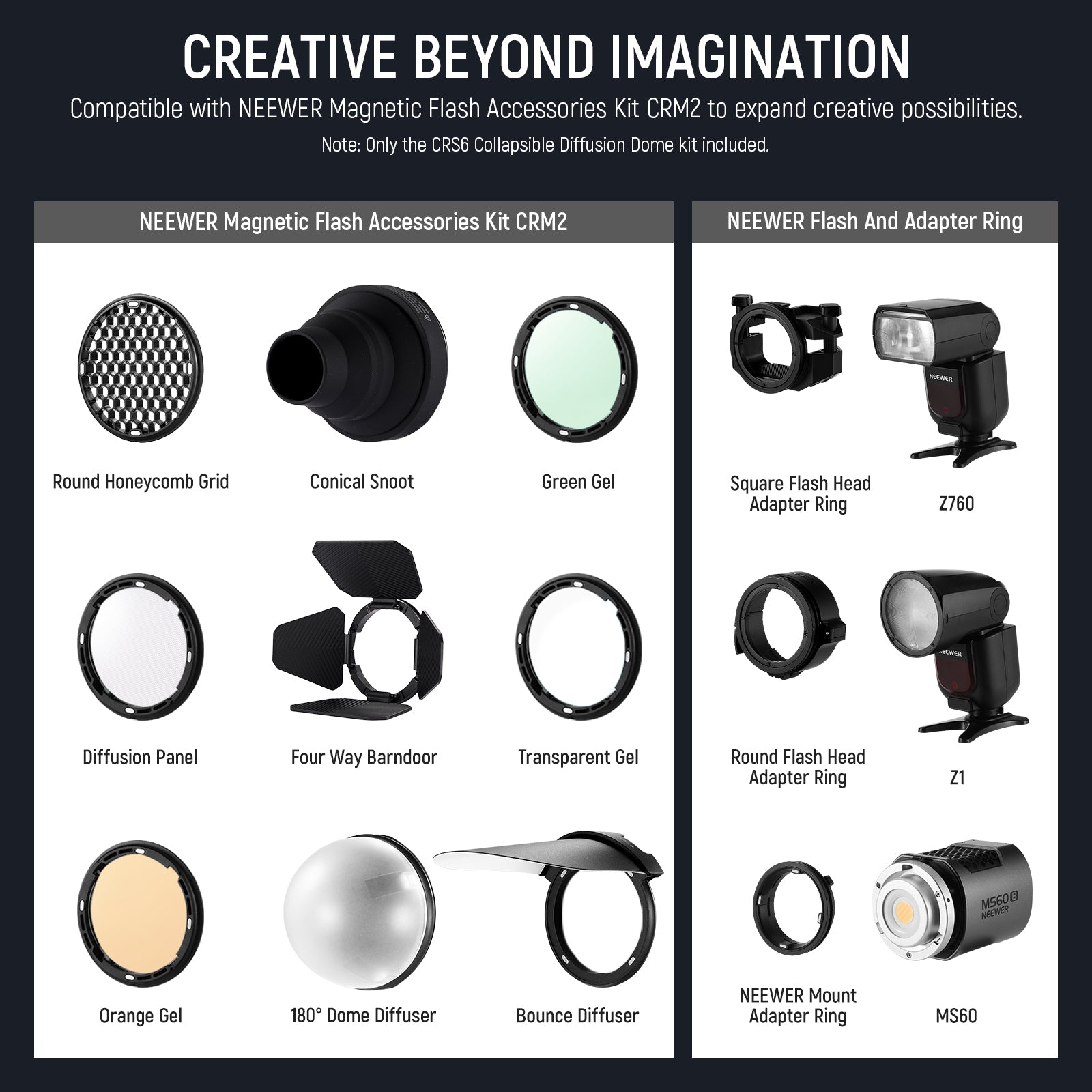 - Three Adapter Rings Included- Effortlessly mount on square heads, round head, or other external flashes and continuous lighting sources with the corresponding adapter rings. Compatible with Godox V1 NEEWER Z1/ Z2 round head flashes, compatible with NEWEER Z760 NW700 NW620 NW645II TT560 square head flash, and compatible with NEEWER Mount Video Light MS60B MS06C MS150B Q45 and more NEEWER CRS6 Diffusion Dome with 3 Adapter Rings, Compatible with Godox V1 NEEWER Z1 Z2 Round Head Flash a