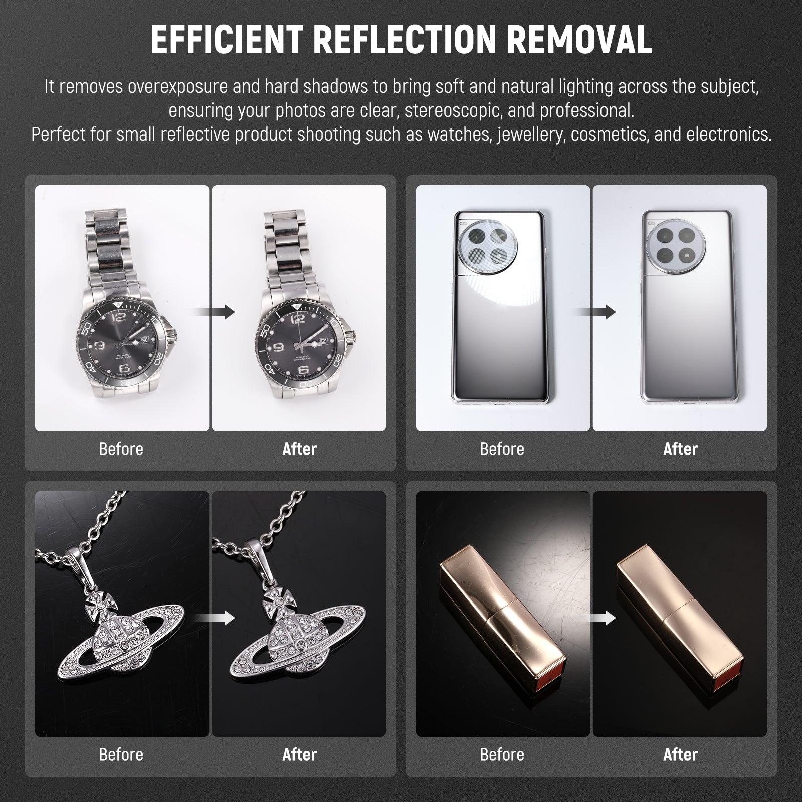 - 360° Light Cone Surround Design- The light cone for 360 degrees surrounds the subject, providing 360° soft lighting adjustment to eliminate harsh glare from shiny products efficiently. The slanted top opening allows for easy shooting and offers diversified angles to capture the best shots of your subjects