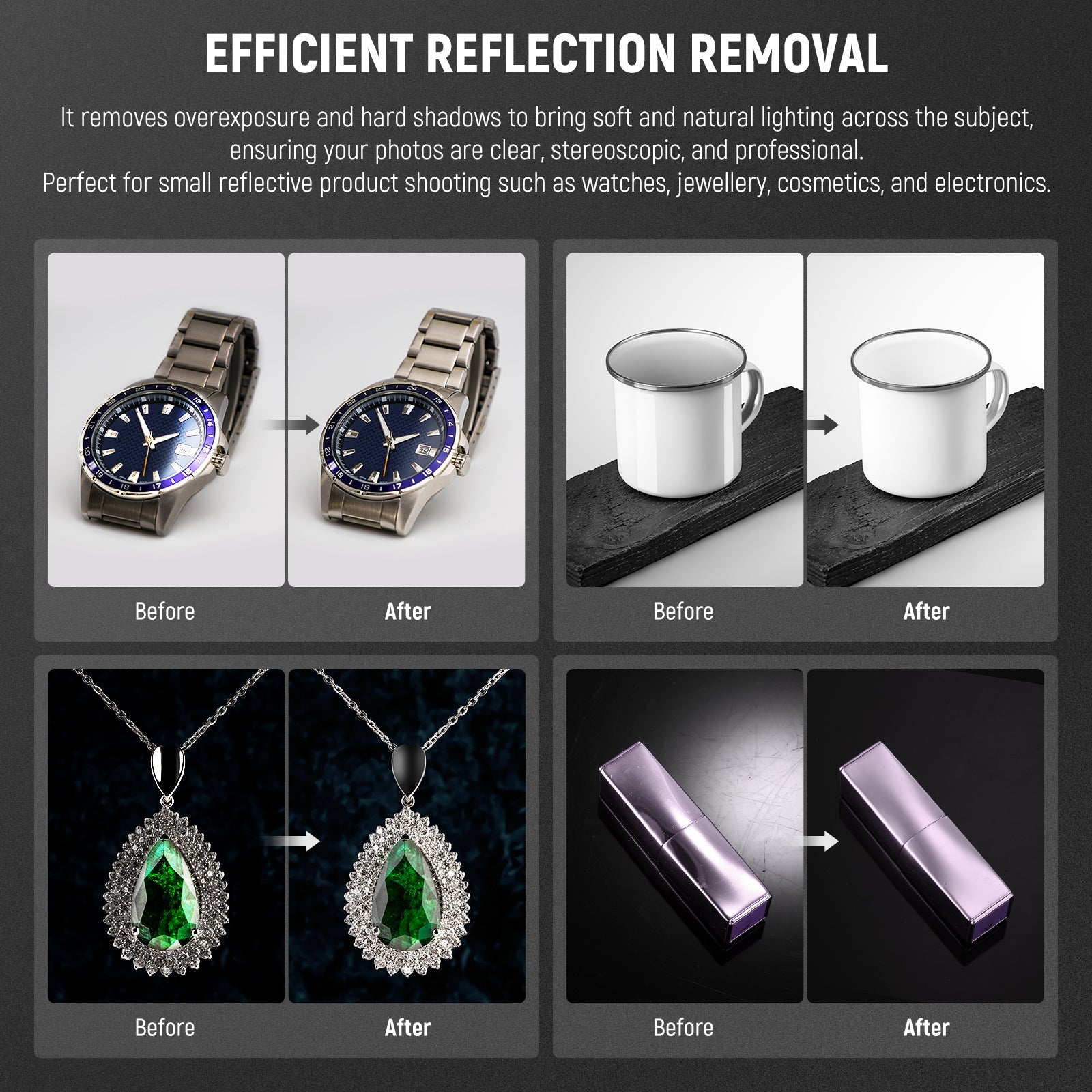 - 360° Light Distribution- The light cones evenly diffuse harsh lighting, eliminate shadows, and minimize reflections on glossy objects. The slanted top opening allows easy camera access, perfect for overhead films and flat lay shots