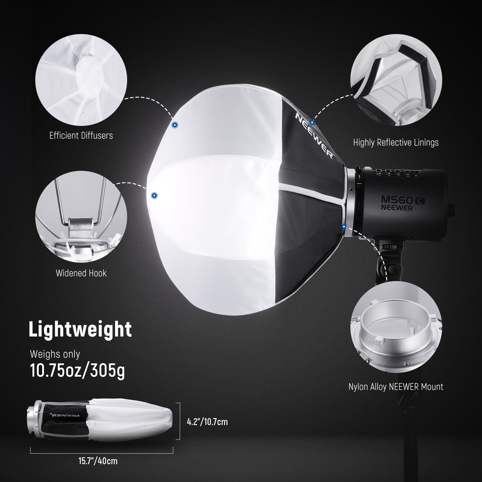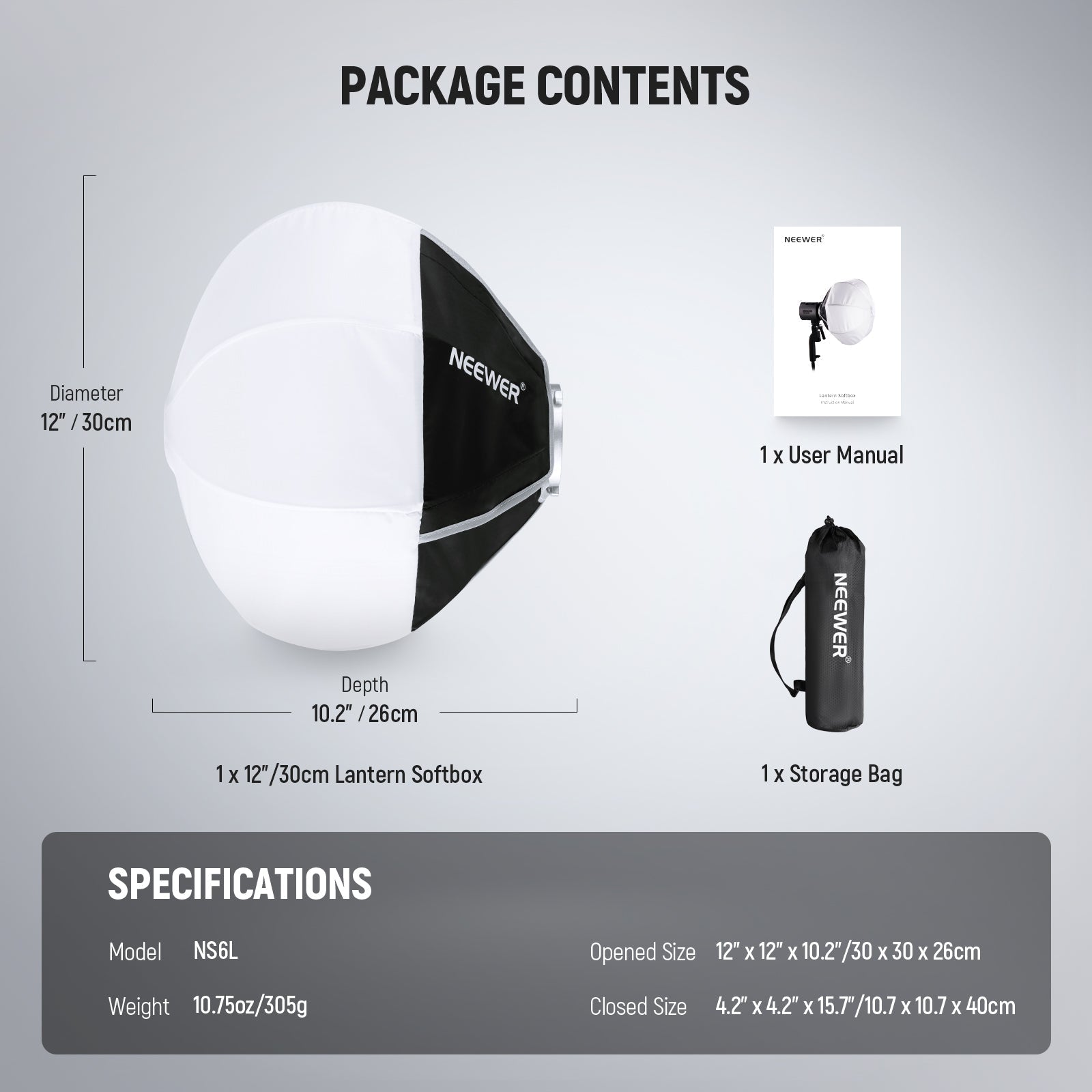 - Lantern Softbox with NEEWER Mount- This 12"/30cm lantern softbox is only compatible with NEEWER MS60 MS60B MS60C MS150B mini LED video lights. Its compact size makes it an ideal choice for on the go outdoor handheld soft lighting setups, allowing for swift switches among NEEWER light modifiers and more accessories with NEEWER mount adapters. NOTE: It is not compatible with Bowens Mount Light.