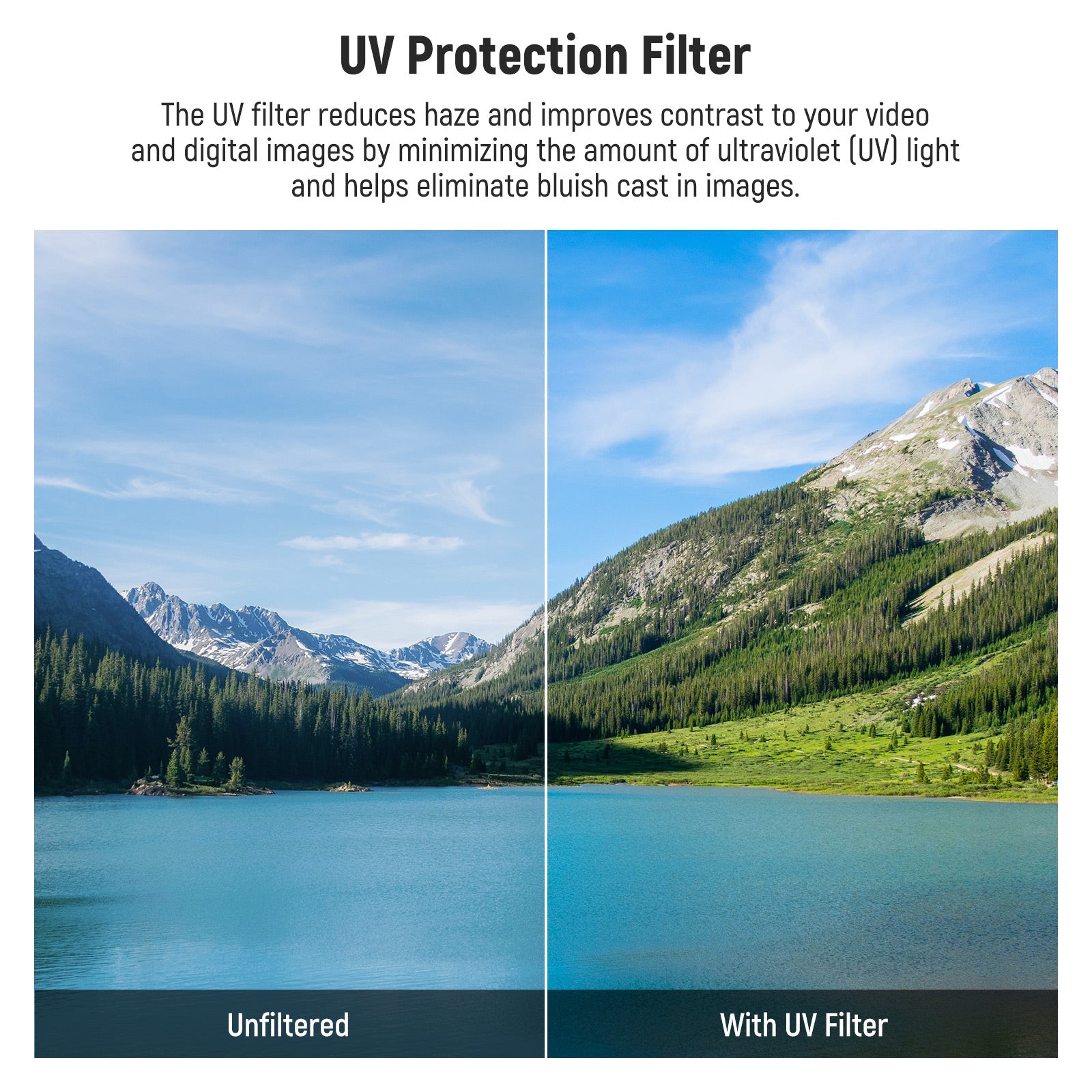 • Protective UV Filter- This UV filter reduces haze and minimizes ultraviolet (UV) rays while improving contrast. Perfect for capturing high altitude and snow photos without the bluish cast. Keep this filter on your lens to protect against dust, scratches, and bumps