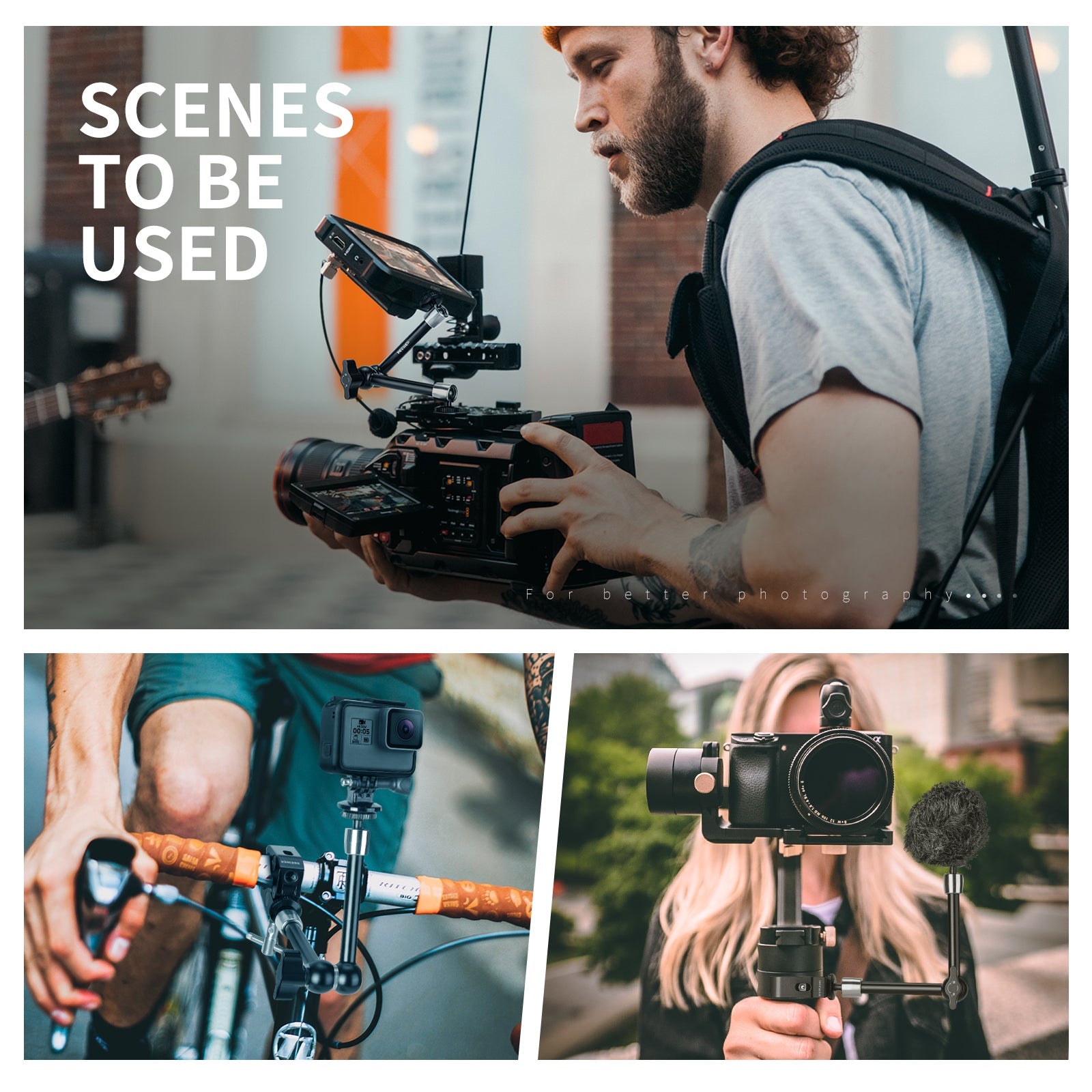 - Stable & Heavy Duty- Includes an articulating friction magic arm with a standard 1/4" screw at one end and a cold shoe adapter at the other end and a super clamp with 1/4" and 3/8" threaded holes. Made of aluminum alloy and stainless steel metal material, the magic arm and super clamp are robust for long term and outdoor use. Mount on flat surfaces or poles and tubes such as a desk, selfie stick, camera phone tripod, light stand, shoulder rig, or bike/bicycle motorcycle handlebar