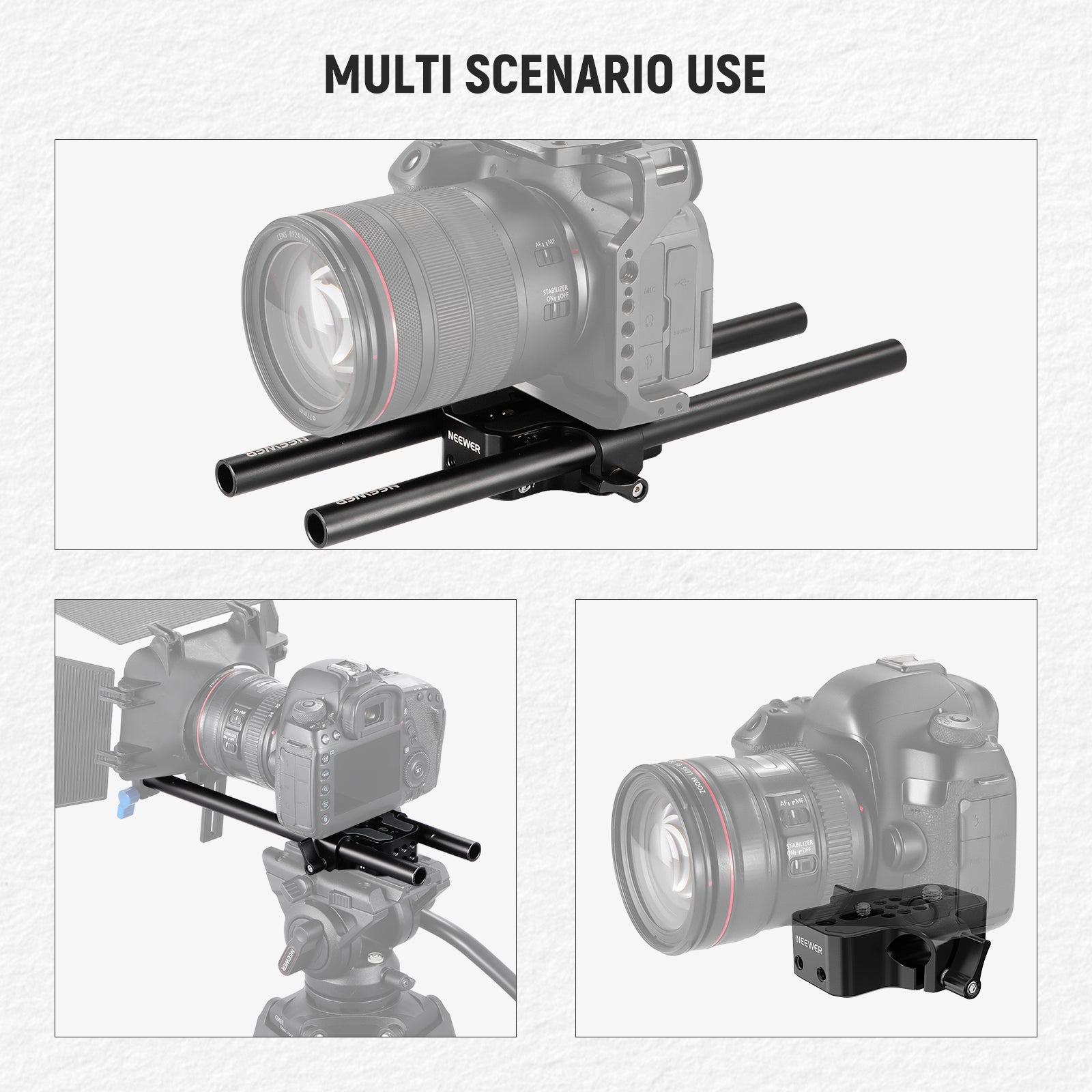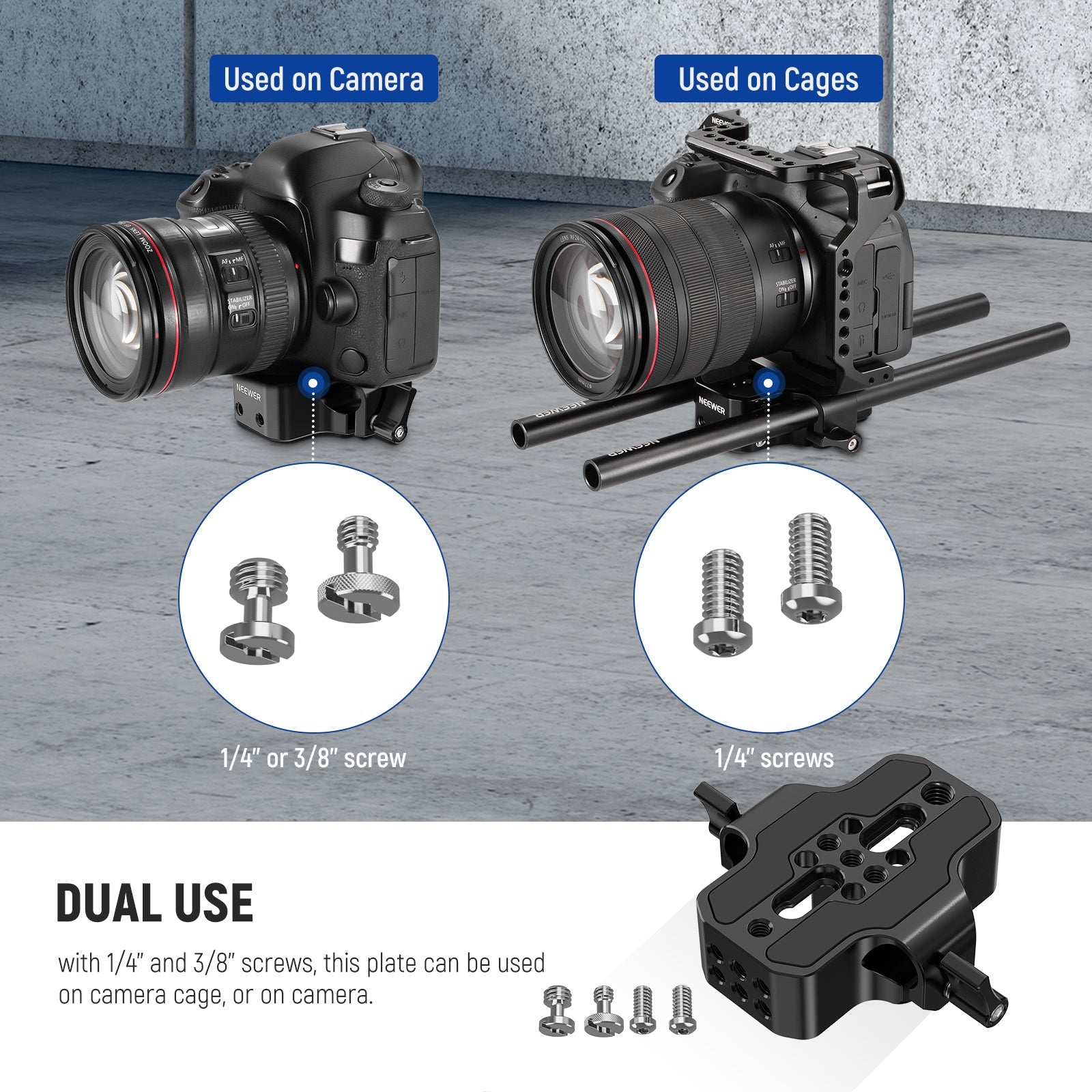 - Wide Adaptability to Cage/Shoulder Rig- On the one hand, the plate includes 1/4" and 3/8" screws that allow you to mount a camera or a quick release plate on a camera cage in different ways; on the other hand, the plate features standard 15mm rails on both sides to install rod for shoulder rig, follow focus and other devices. Compatible with SmallRig 1053 3010