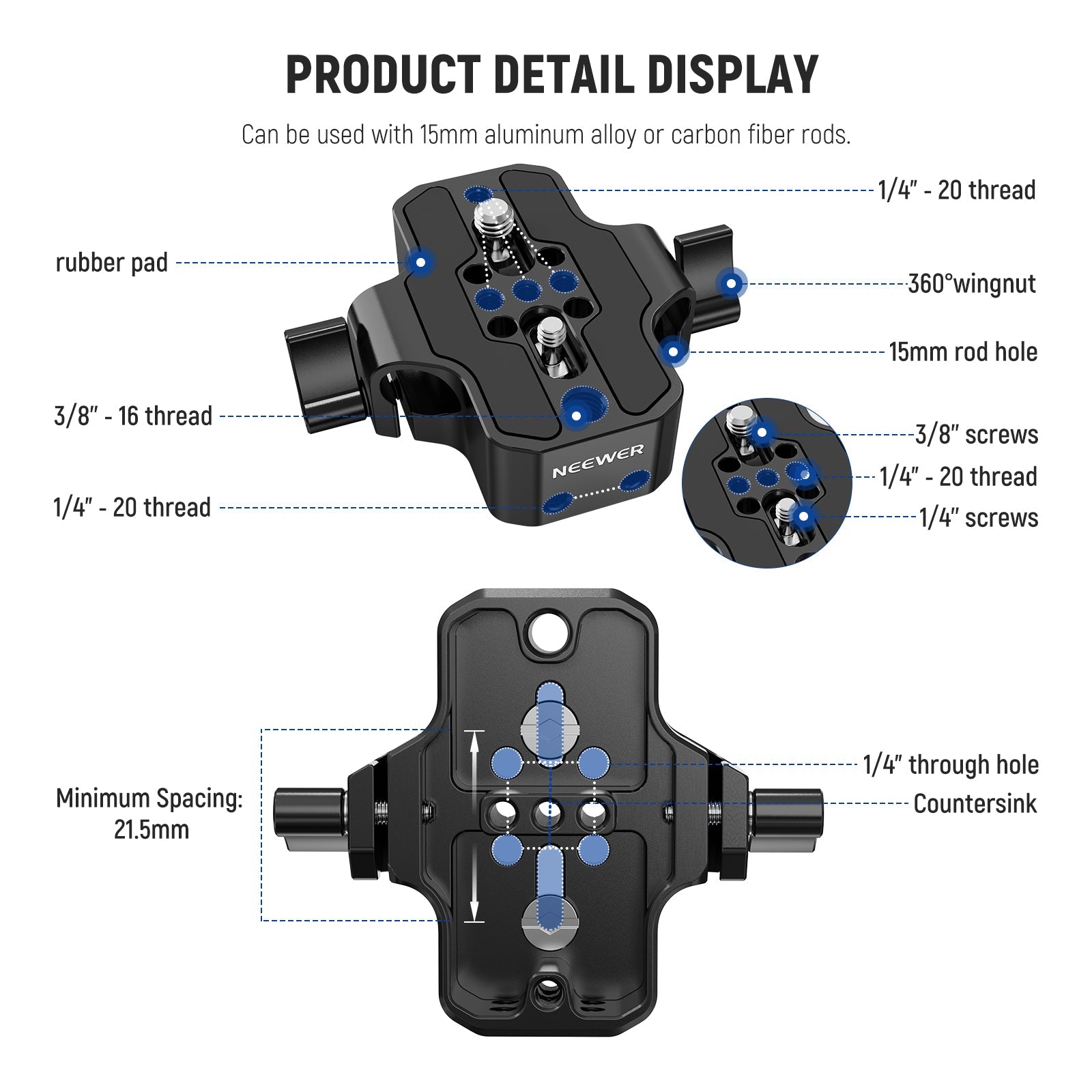 - Multiple Mounting Mounts Available- The base plate features extra flexibility with several 1/4" mounting holes on the front and back, making it easier to connect other accessories, such as camera monitor. Use the bottom 1/4" or 3/8" threaded screw holes or counterbore to easily mount the plate on a tripod or other compatible quick release plate