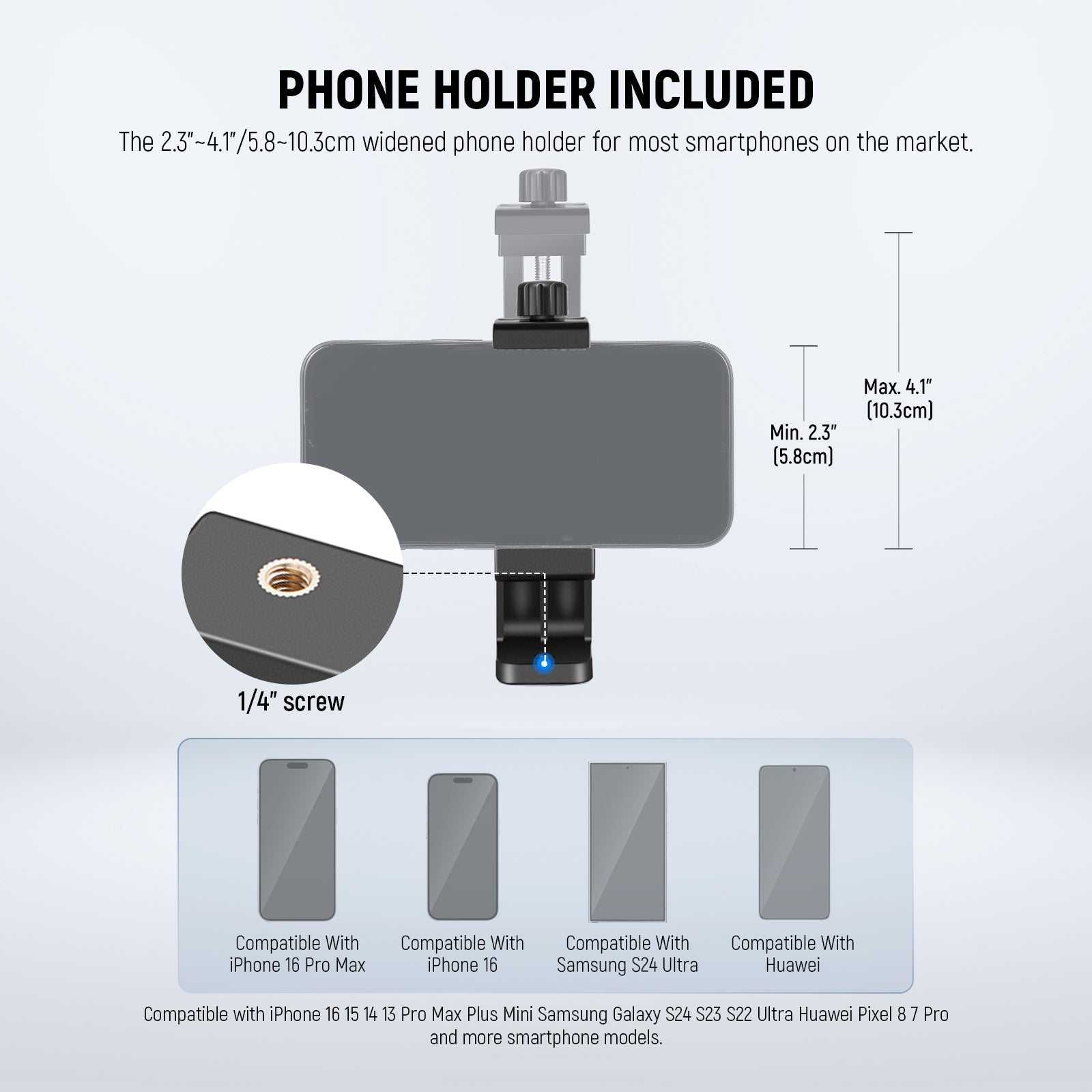 • Universal Phone Holder- The tall standing tripod’s adjustable mobile phone holder is compatible with iPhone 16 15 Pro Max Plus i Phone 14 13 smartphone Samsung Galaxy S24 S23 Ultra Google Pixel 9 8 7 Pro android phone, etc., with one cold shoe to attach LED fill lights, microphones, and more photography & videography accessories. Also can mount DSLR (compatible with Sony Canon Nikon cameras) or action cameras (adapters not included) on the tri pod stand head via a 1/4" screw