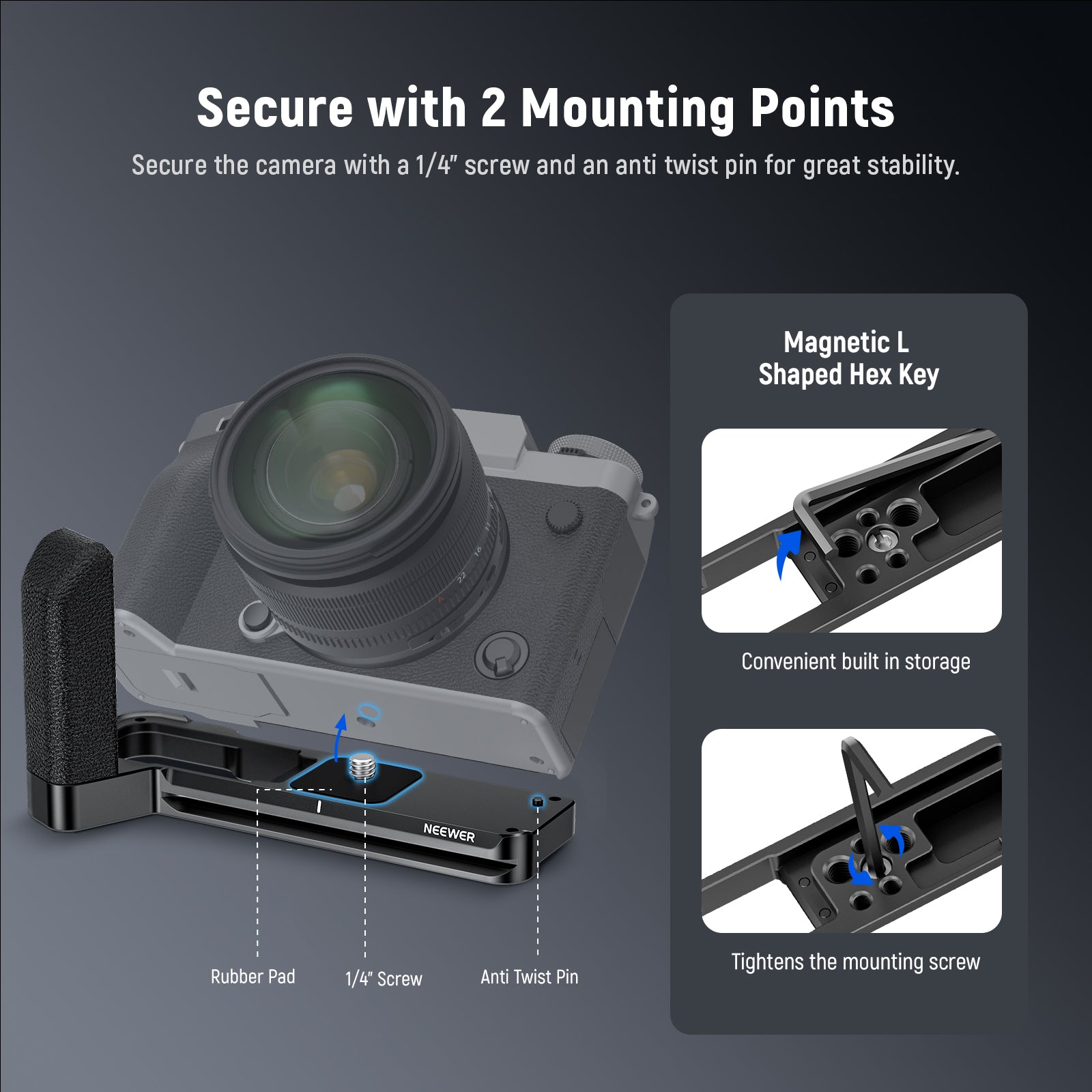 • Firm & Effortless Installation- The L plate firmly attaches to the camera through a 1/4" screw with a rubber pad to protect against scratches. An anti twist pin on the left can effectively prevent the camera from deflecting. And a magnetic L shaped hex key makes installing or removing the camera a breeze