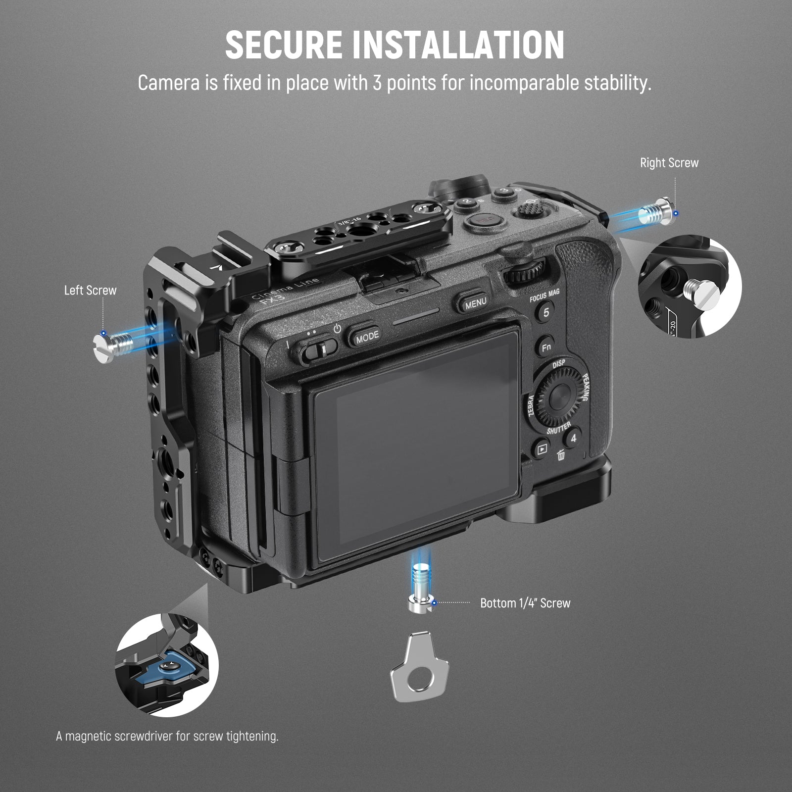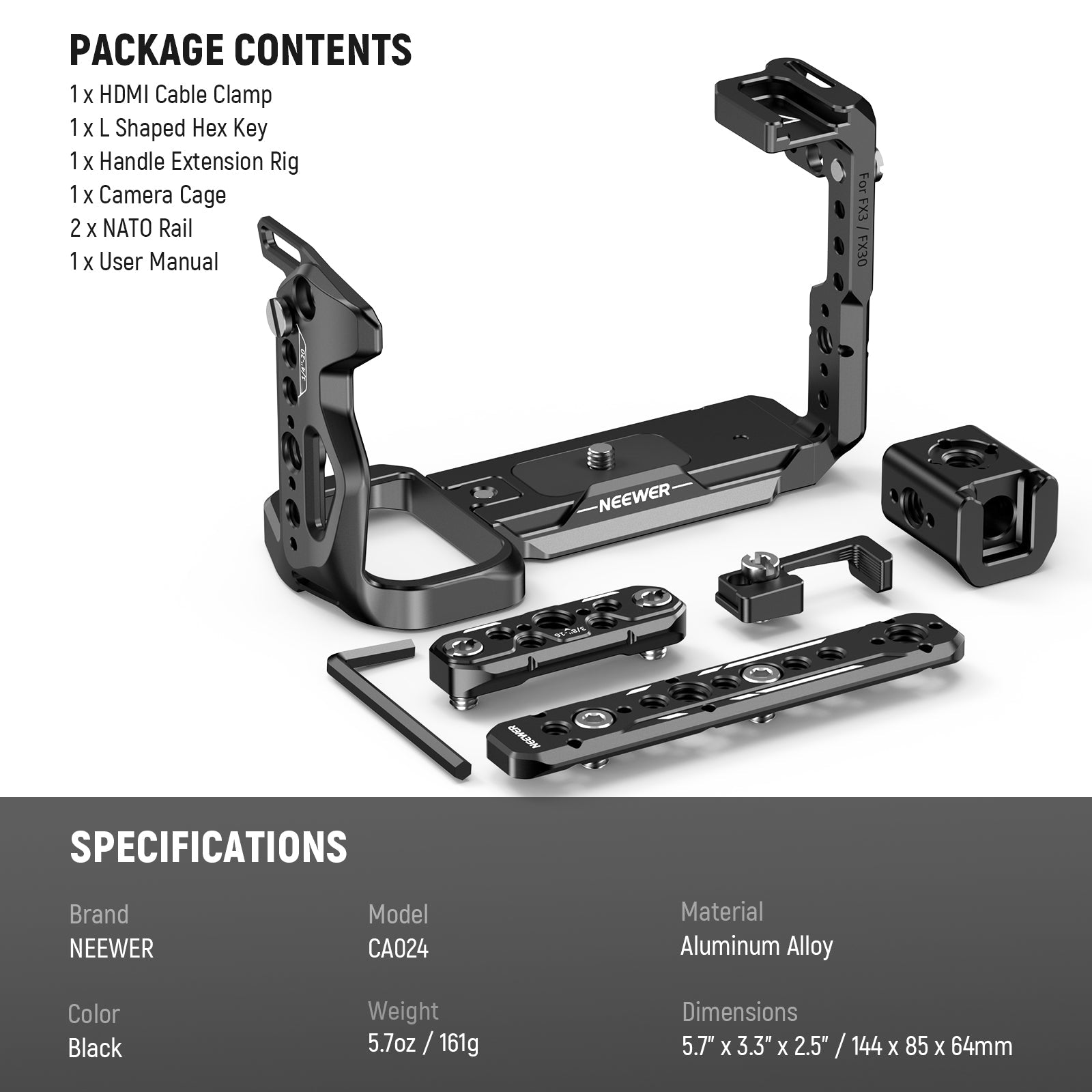 - Aluminum Alloy Camera Cage for FX3/FX30- Compatible with Sony FX30 and FX3 cameras, this kit contains a camera cage, an XLR handle extension rig, a handle rail, a NATO rail, and an HDMI cable clamp for video recording and filmmaking. A magnetic screwdriver under the cage helps you fasten screws with ease. The original XLR handle can be installed after removing the NATO rail