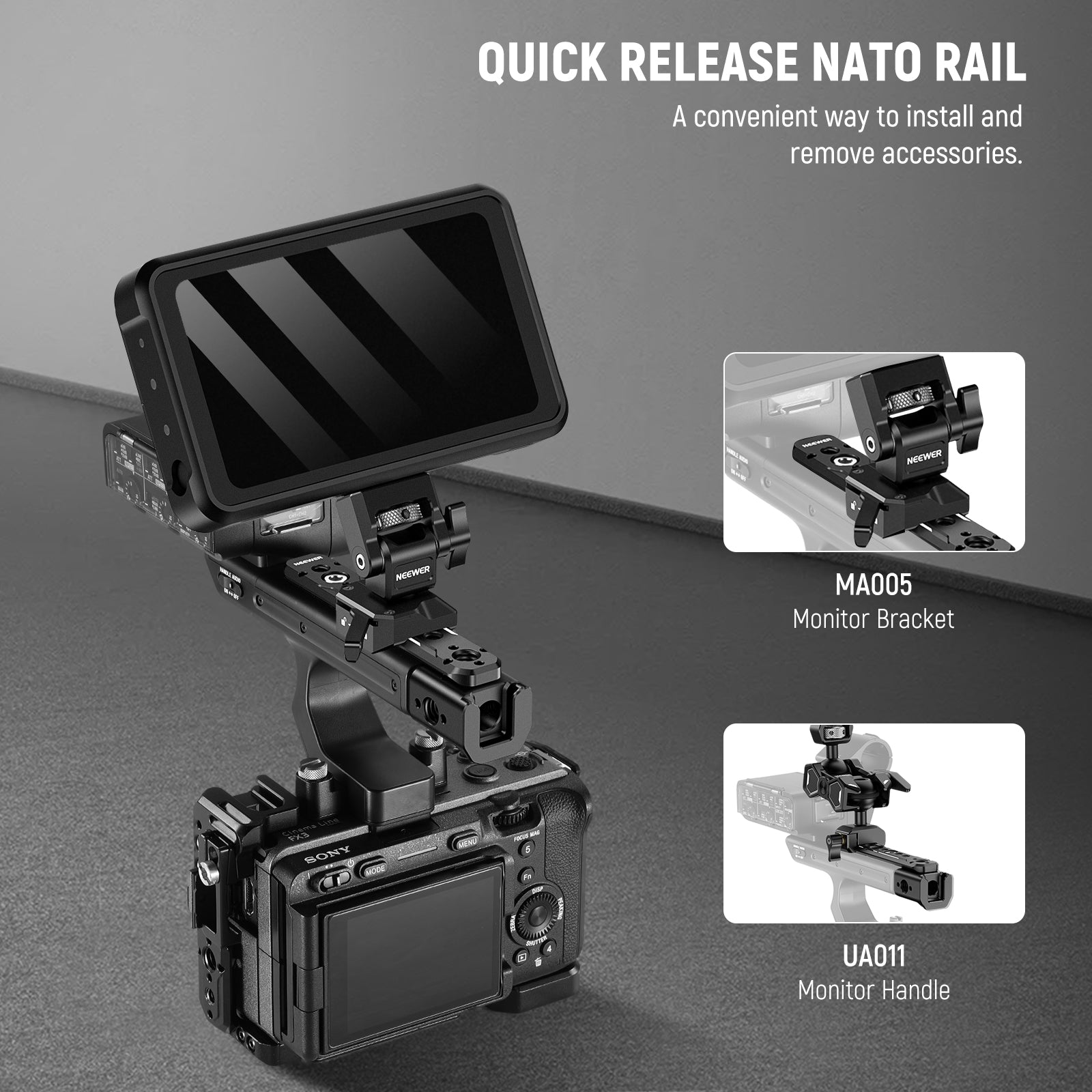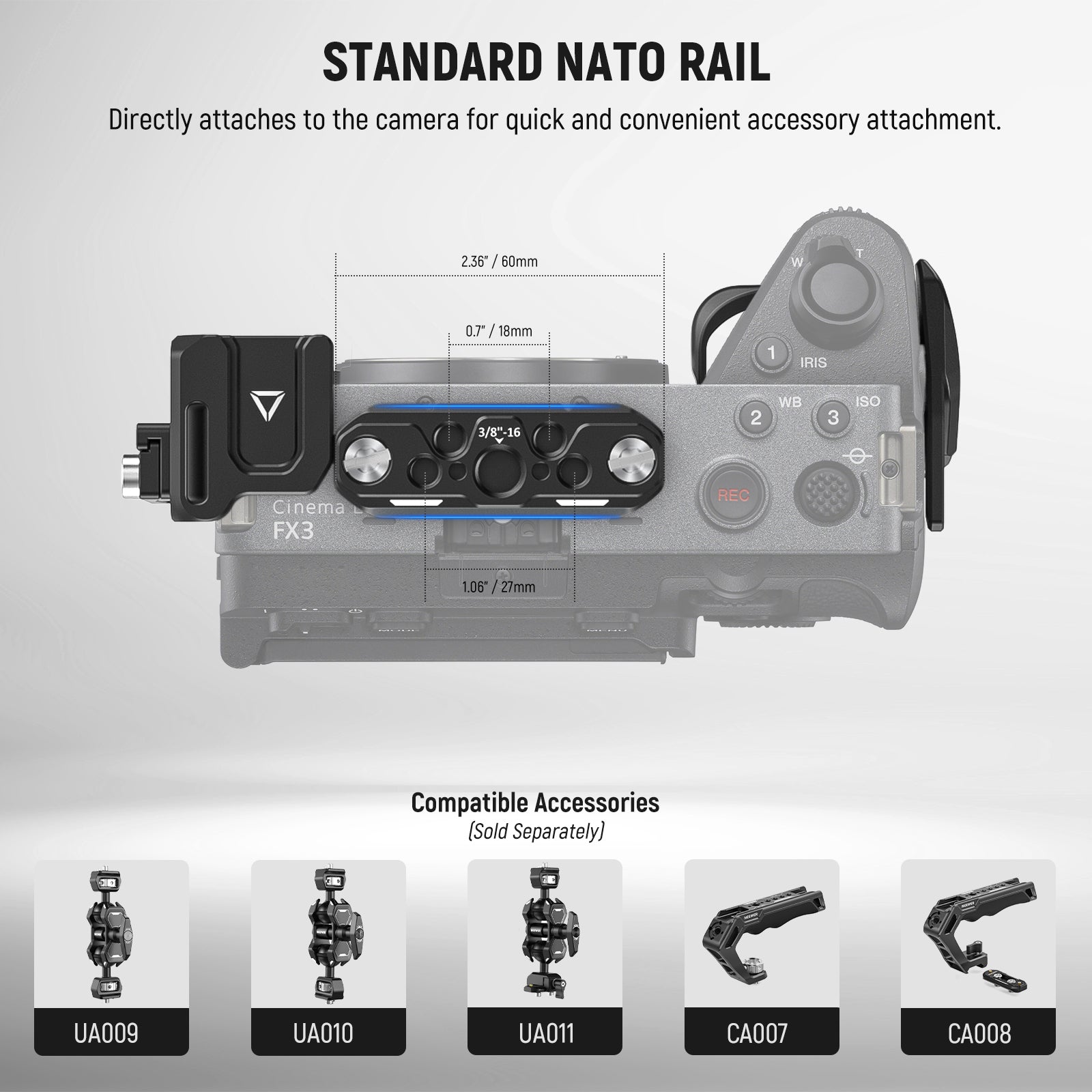 - NATO Rail for Fast Connection- Mounted on top of the FX3/FX30 camera via two 1/4" screws, the NATO rail with quick release lets you quickly yet safely install accessories like top handles, clamps, monitor mounts, and magic arms. Note: The NATO rail features 18mm and 27mm spacing between two 1/4" screws for a wide range of accessories