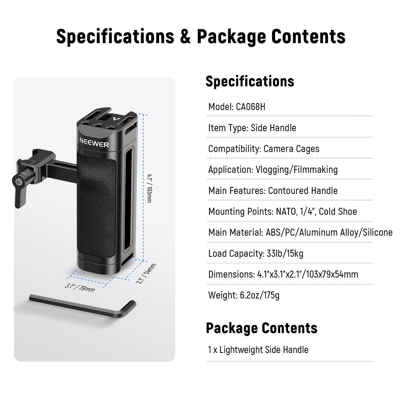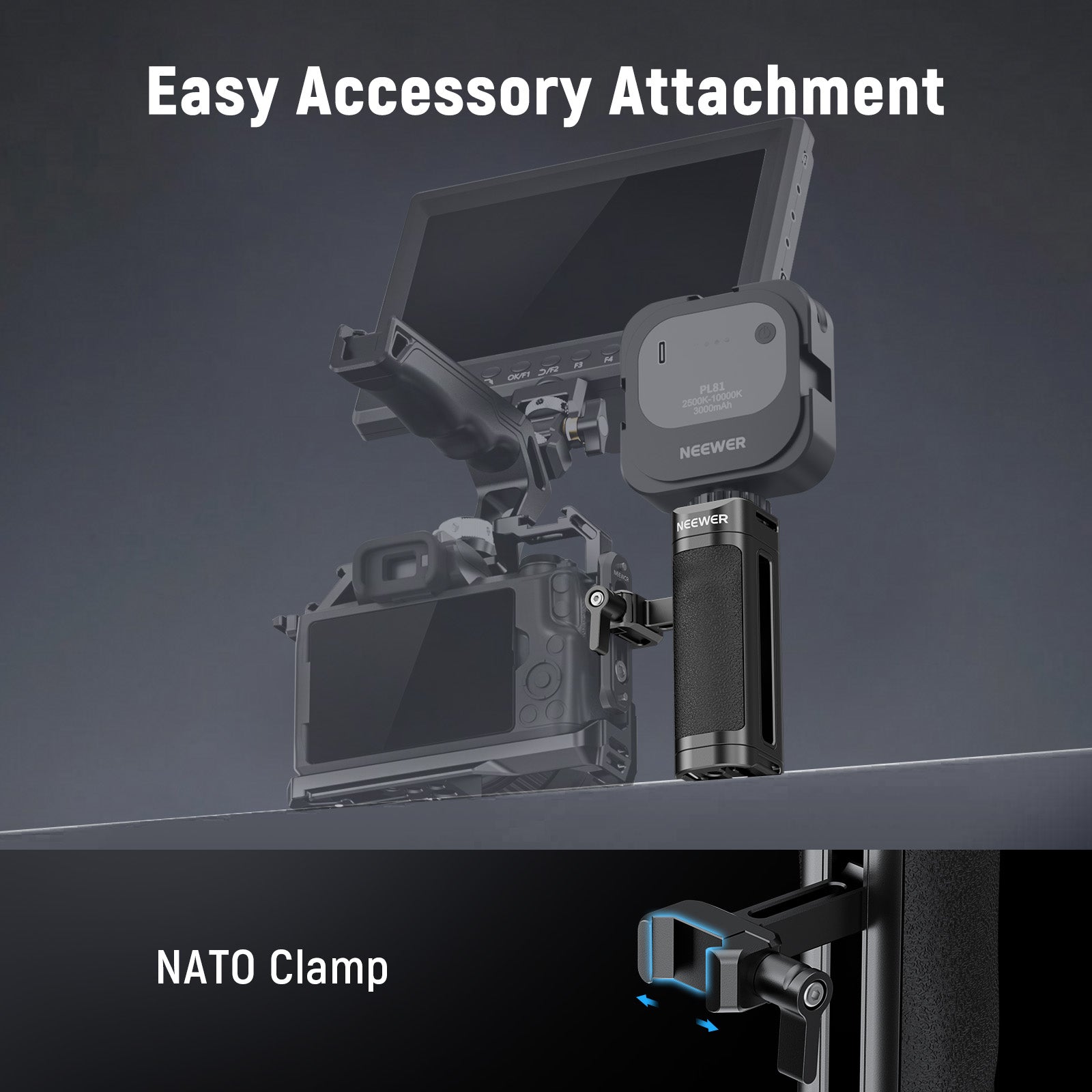 • Ultra Lightweight NATO Side Handle- This lightweight (6.2oz/175g) mini side handle attaches to your camera cage or video rig via the NATO clamp. It helps you stabilize a DSLR or mirrorless camera of up to 33lb (15kg) and is compatible with SmallRig and NEEWER camera cages (CA020 CA019 CA014 CA011 CA002) with NATO rails. Or, you can separately purchase NEEWER UA003/UA007/UA022 NATO rails to make any camera cage fully compatible