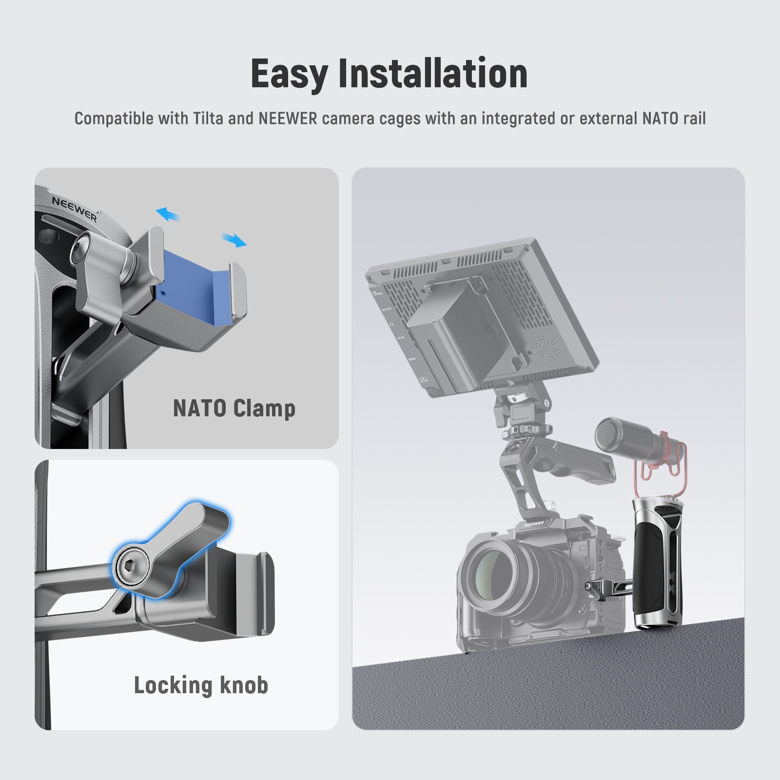 - Quick Release NATO Clamp- The NATO clamp can quickly and securely attach to a NEEWER camera cage with integrated or external NATO rails. Also compatible with SmallRig camera cages; compatible with Tilta camera cages