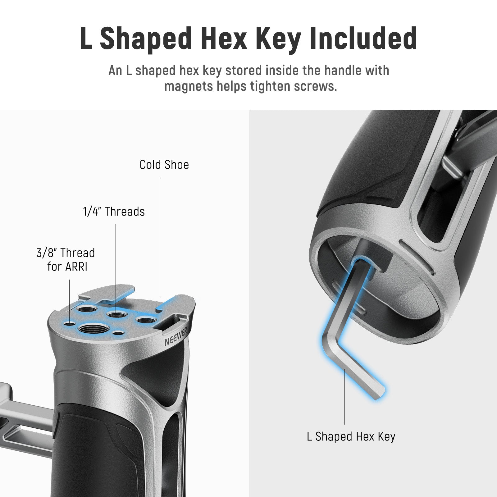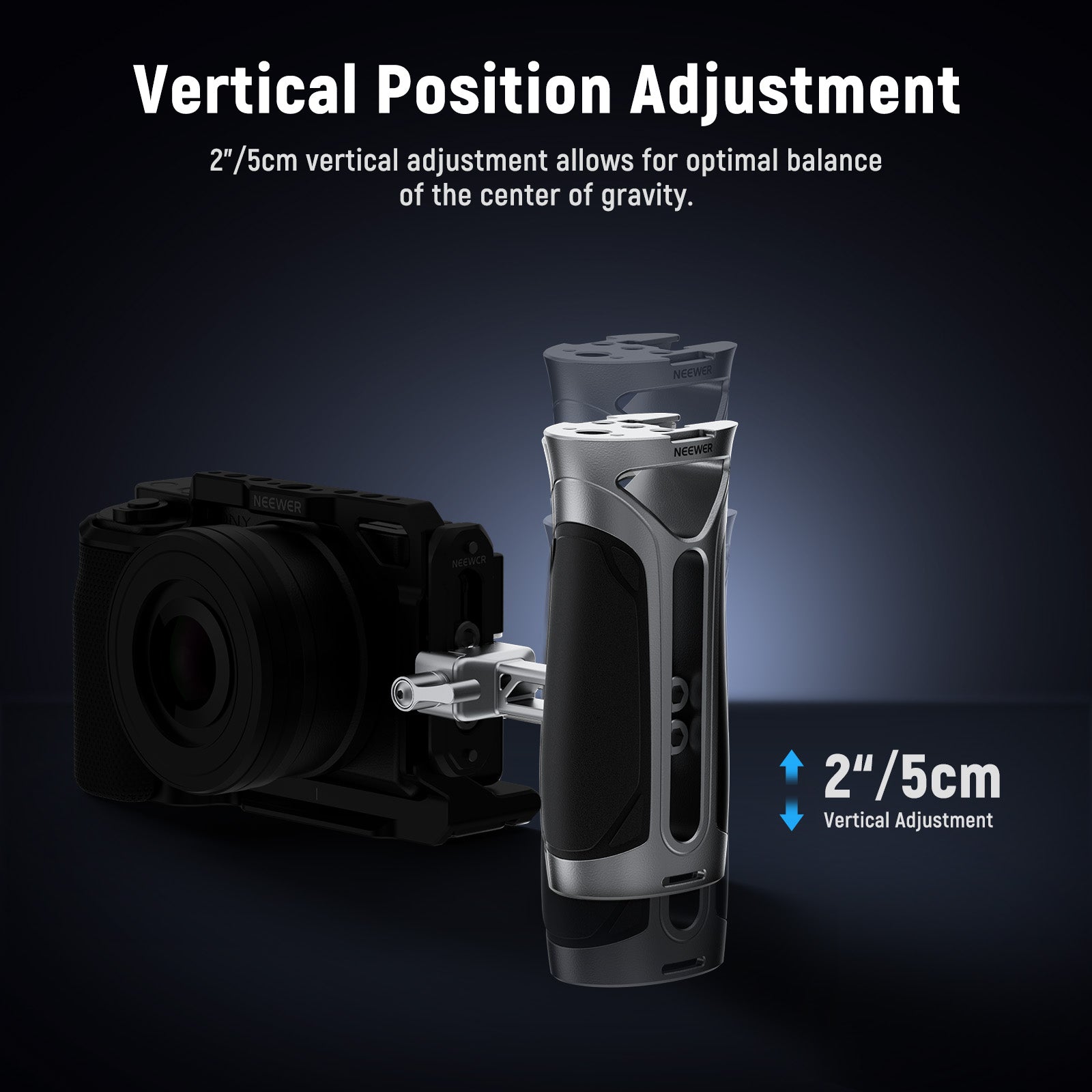 - 2"/5cm Vertical Adjustment- The connector arm supports 2"/5cm vertical adjustment for balancing the center of gravity and can be installed in either direction for the left or right hand. A hex key placed inside the handle helps you tighten the screws